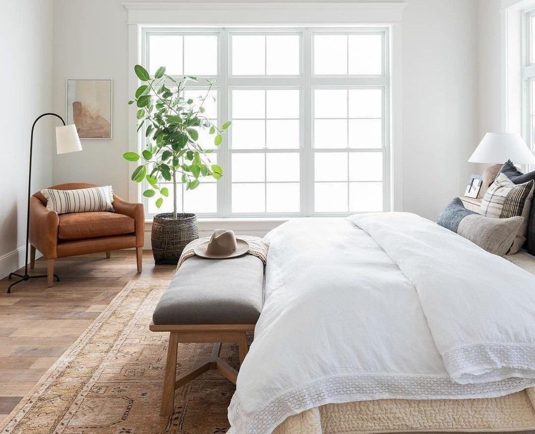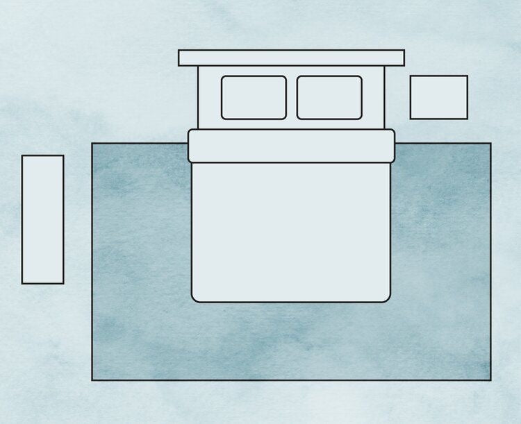Another option for when you’d like to invest in a rug smaller is to leave out the side tables and the upper half of the bed and have the rest of the bed and your ottoman on the rug. This is especially great when you want to show off your newly done flooring but also not miss out on a rug.