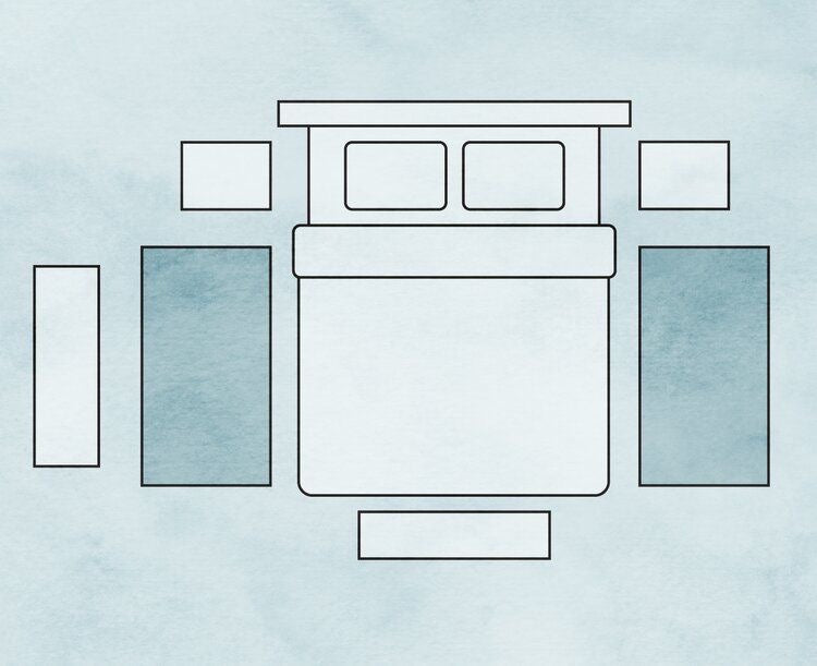 A smart way of not covering up too much of your floor while also complementing it with a rug is to use runners on either side of the bed. These do not essentially have any furniture placed on them but are great at unifying the look of the room and making the floor space seem bigger.