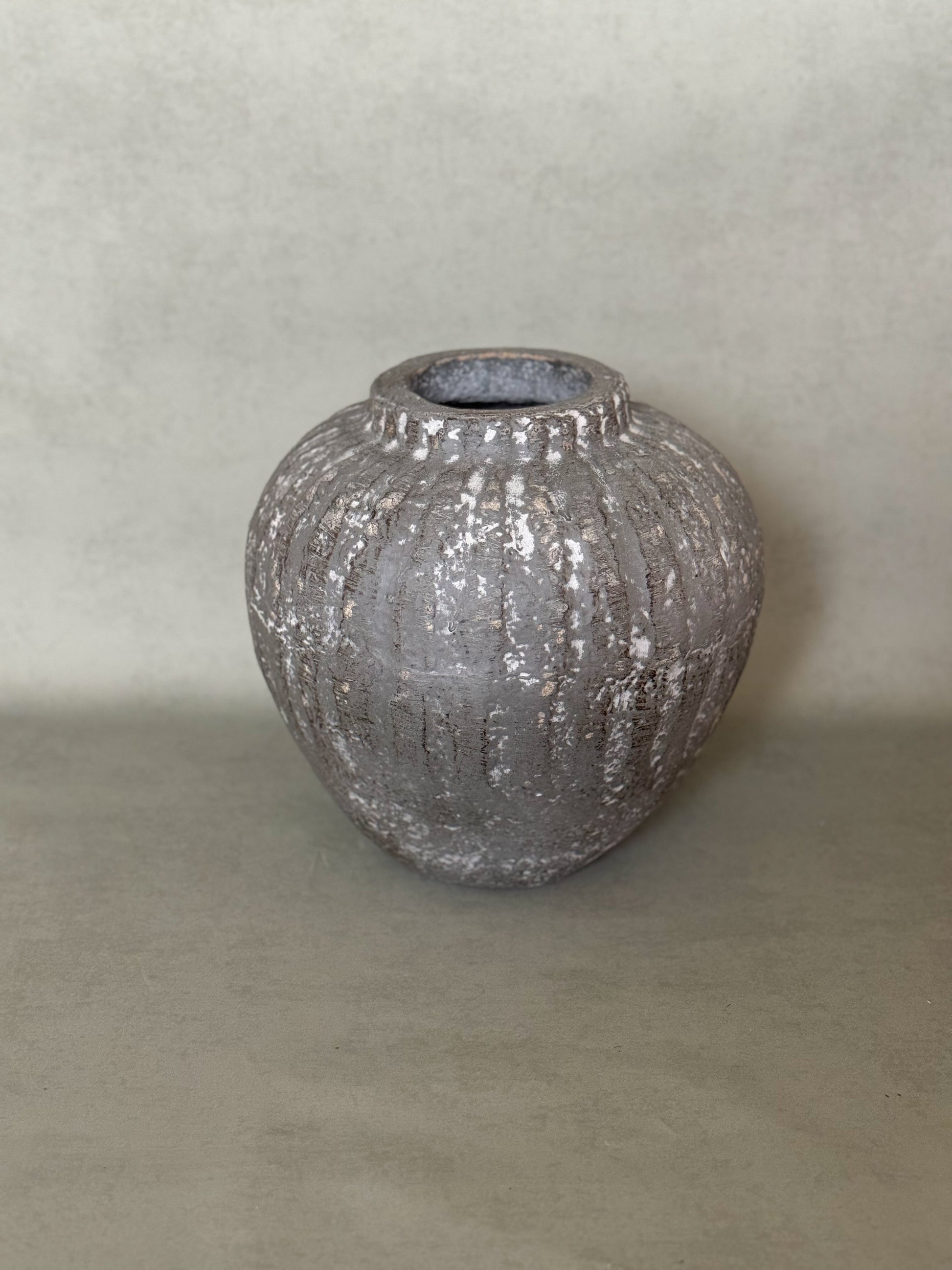 This vase features a round shape and unique paper mache texture that adds significant character to any space.