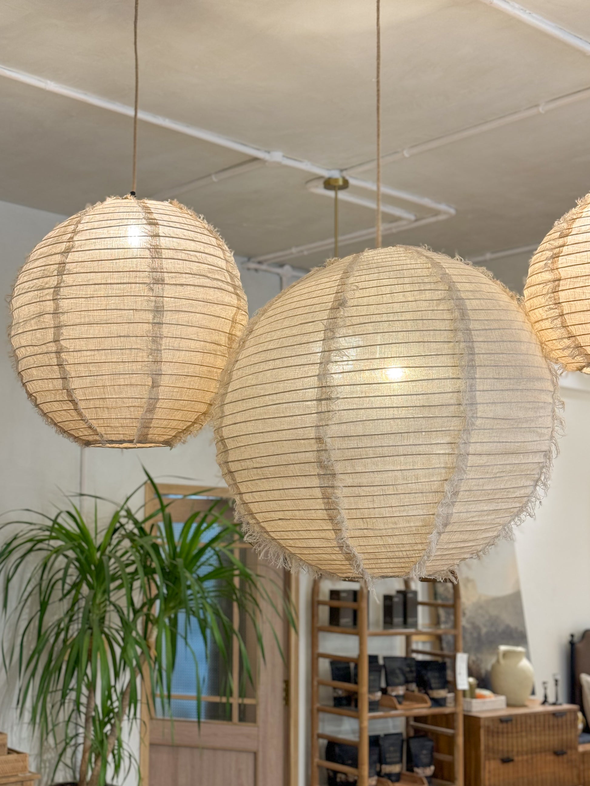 Made using a bamboo frame wrapped in linen fabric, this ceiling pendant light casts a soft, warm glow while adding natural texture to your space. Its rounded form works beautifully as a single statement or styled in clusters, pairing effortlessly with modern, earthy, and minimal interiors.