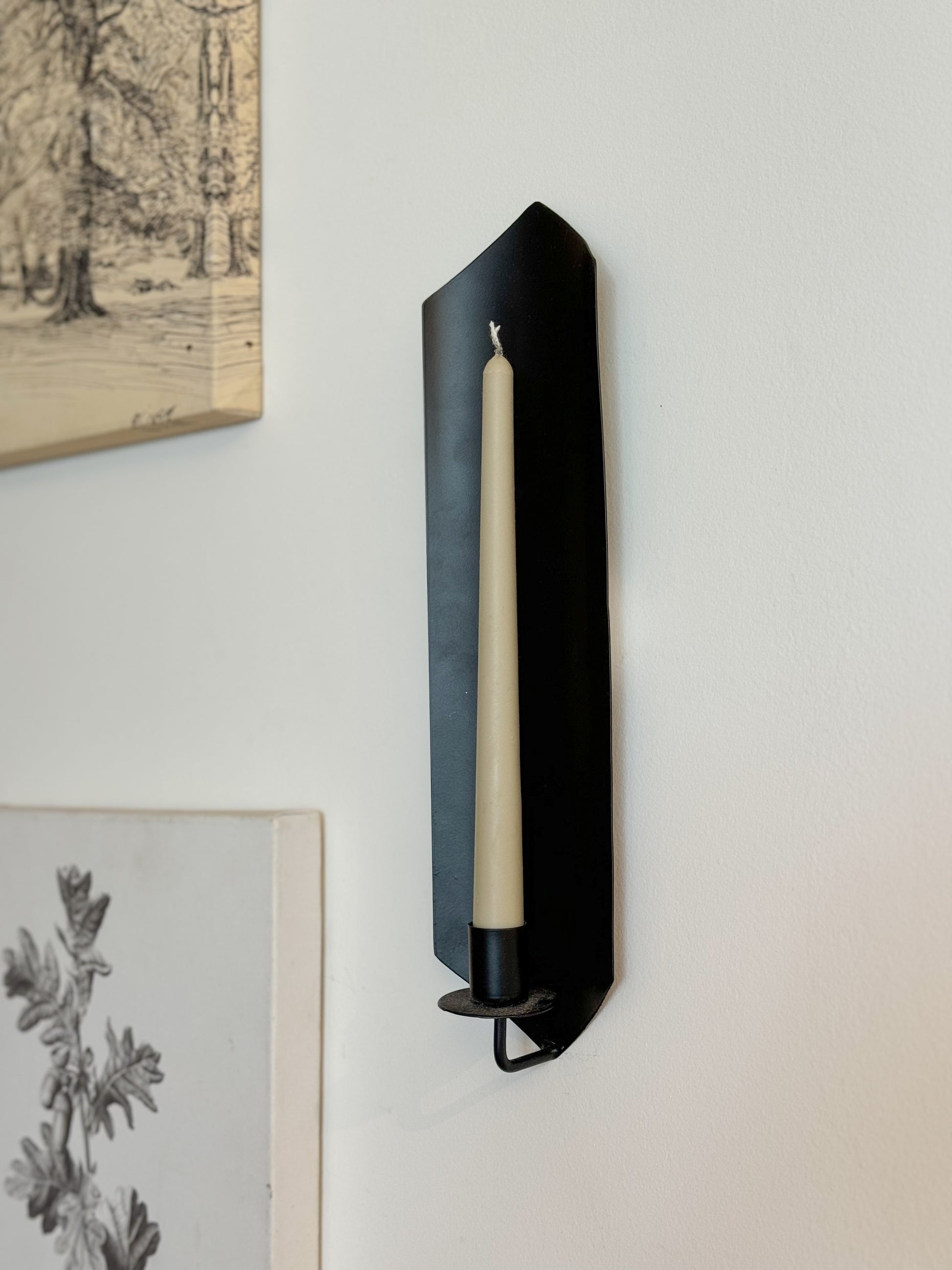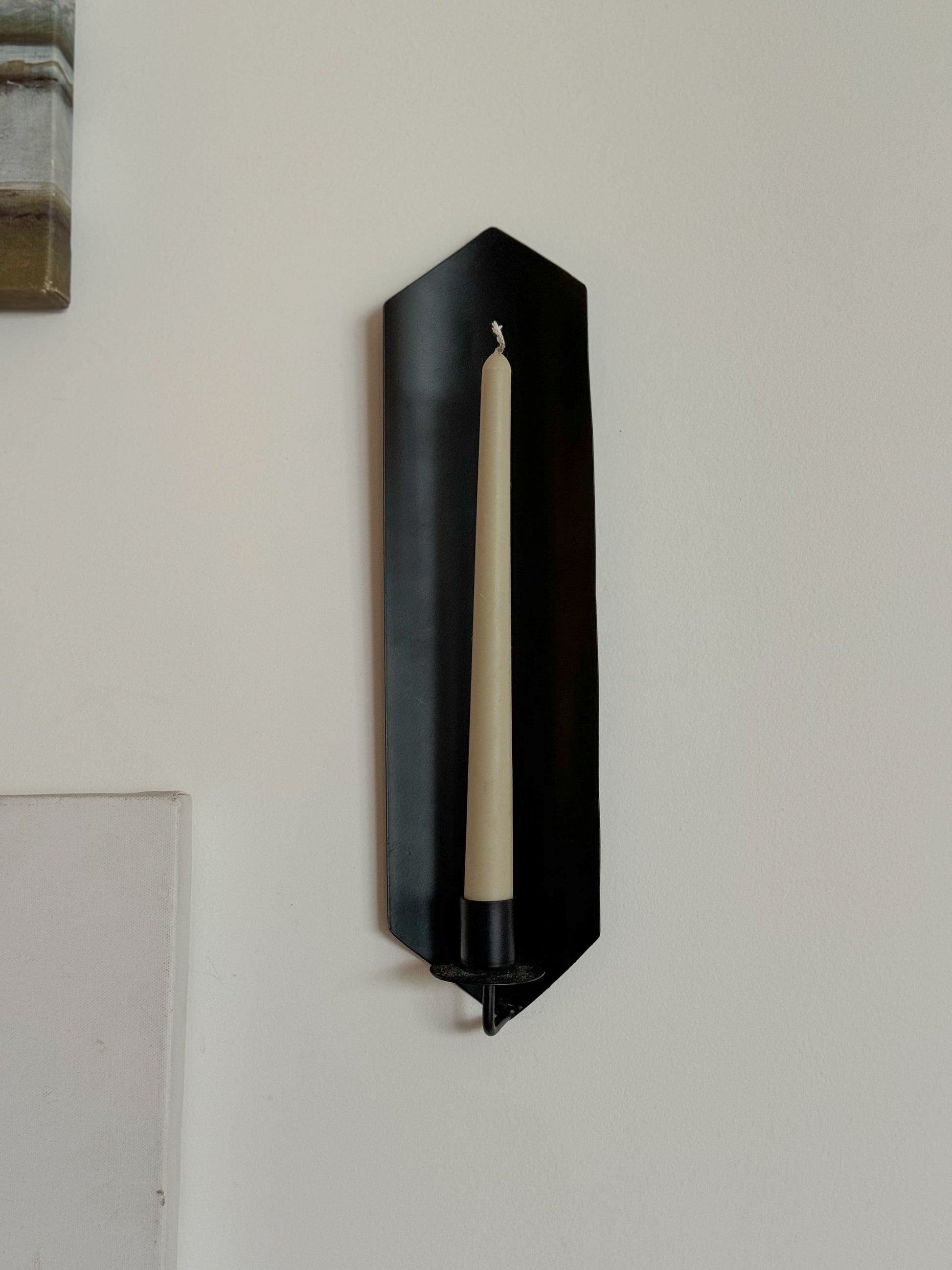 This candle stand adds a touch of elegance to any room with its sleek black metal design. It's a sophisticated addition to your home decor, serving as both a functional and stylish wall piece.