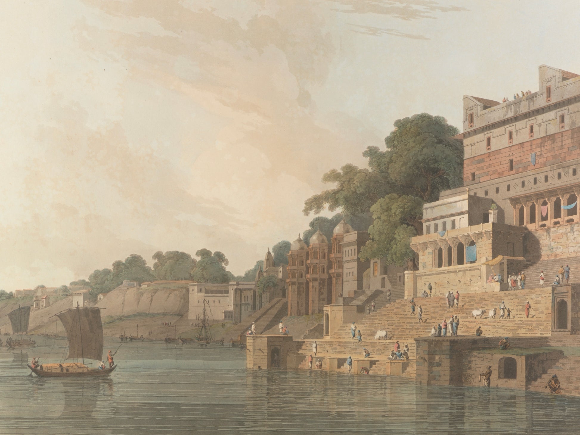 A captivating vintage painting from the 1800s, depicting the sacred city of Benares along the banks of the Ganges, its vibrant ghats alive with timeless spirituality and culture.