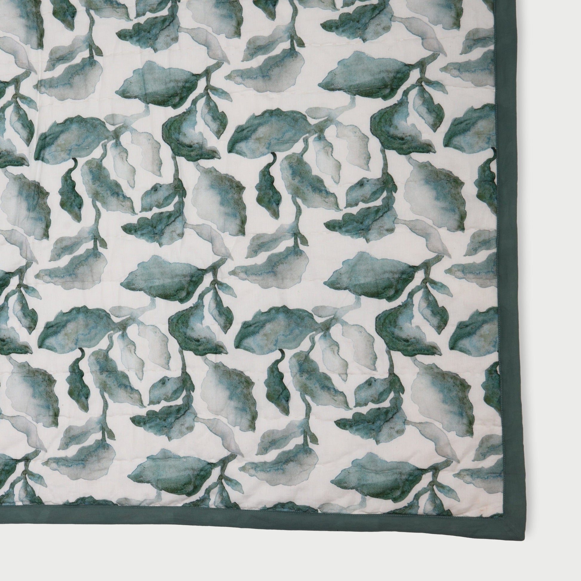 Our Cascade Speckle features original watercolour artwork by Ramita printed on fine cotton. The quilt comes with a soft 100% cotton fabric tucked together and finished with a teal trim.