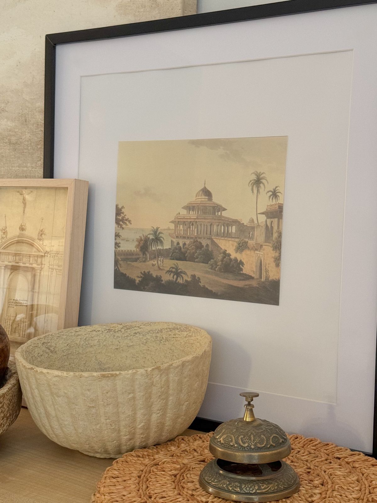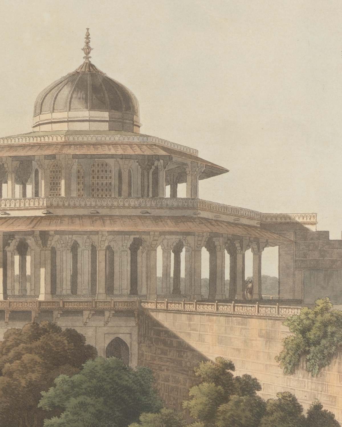 A historic vintage painting from the 1800s, showcasing the majestic Chalees Satoon pavilion along the banks of the Jamuna, its iconic arches standing gracefully by the flowing river.
