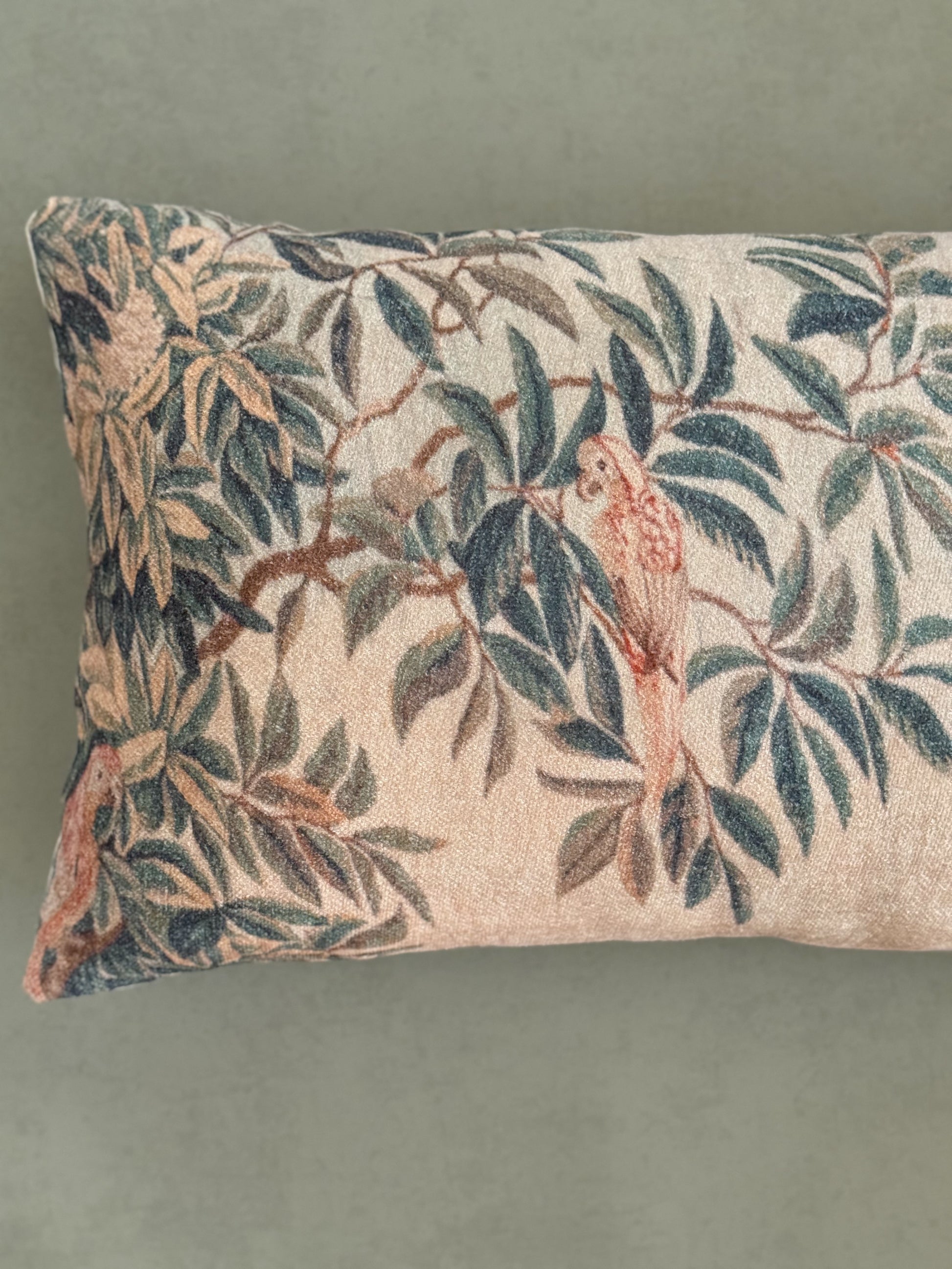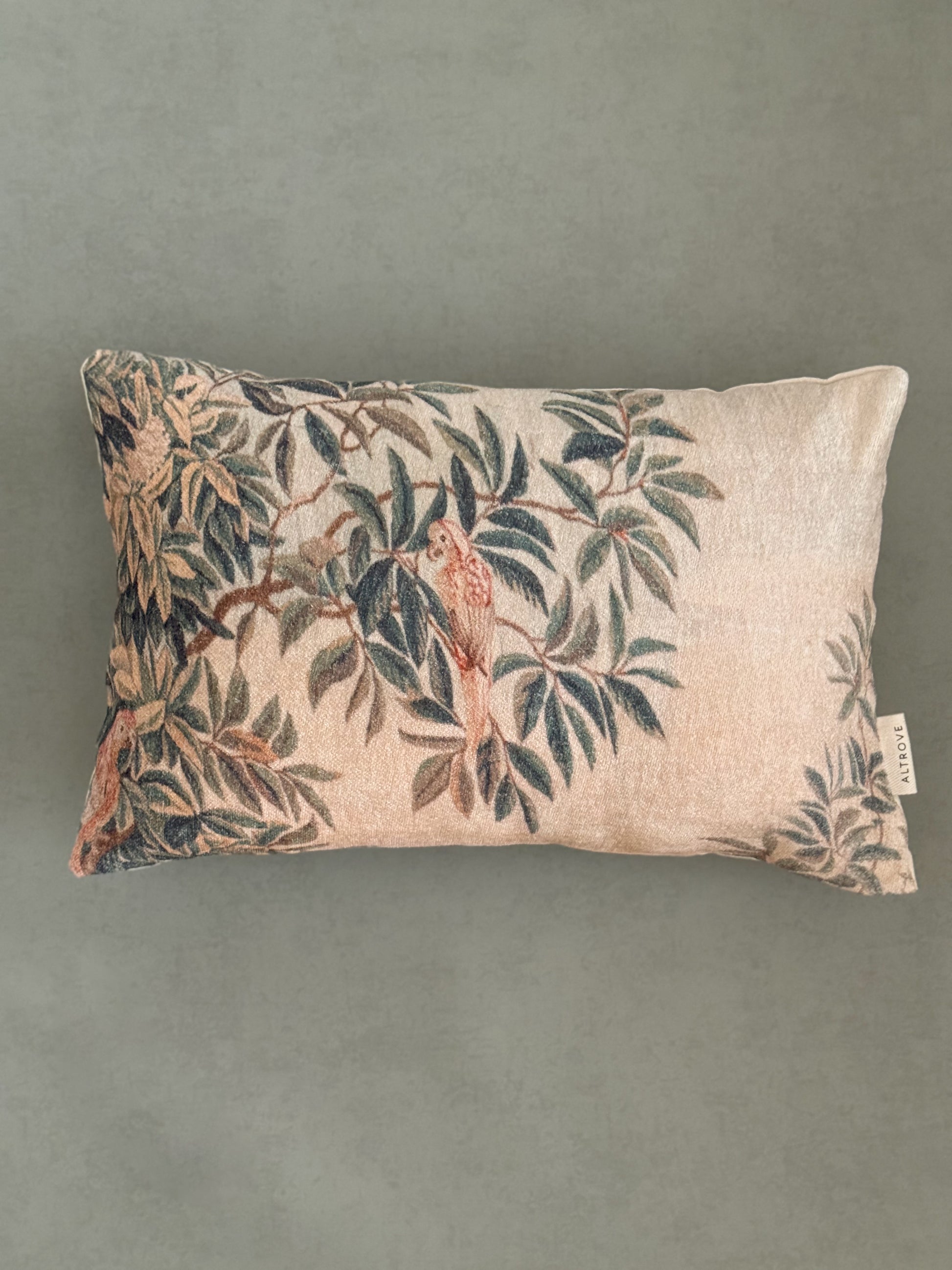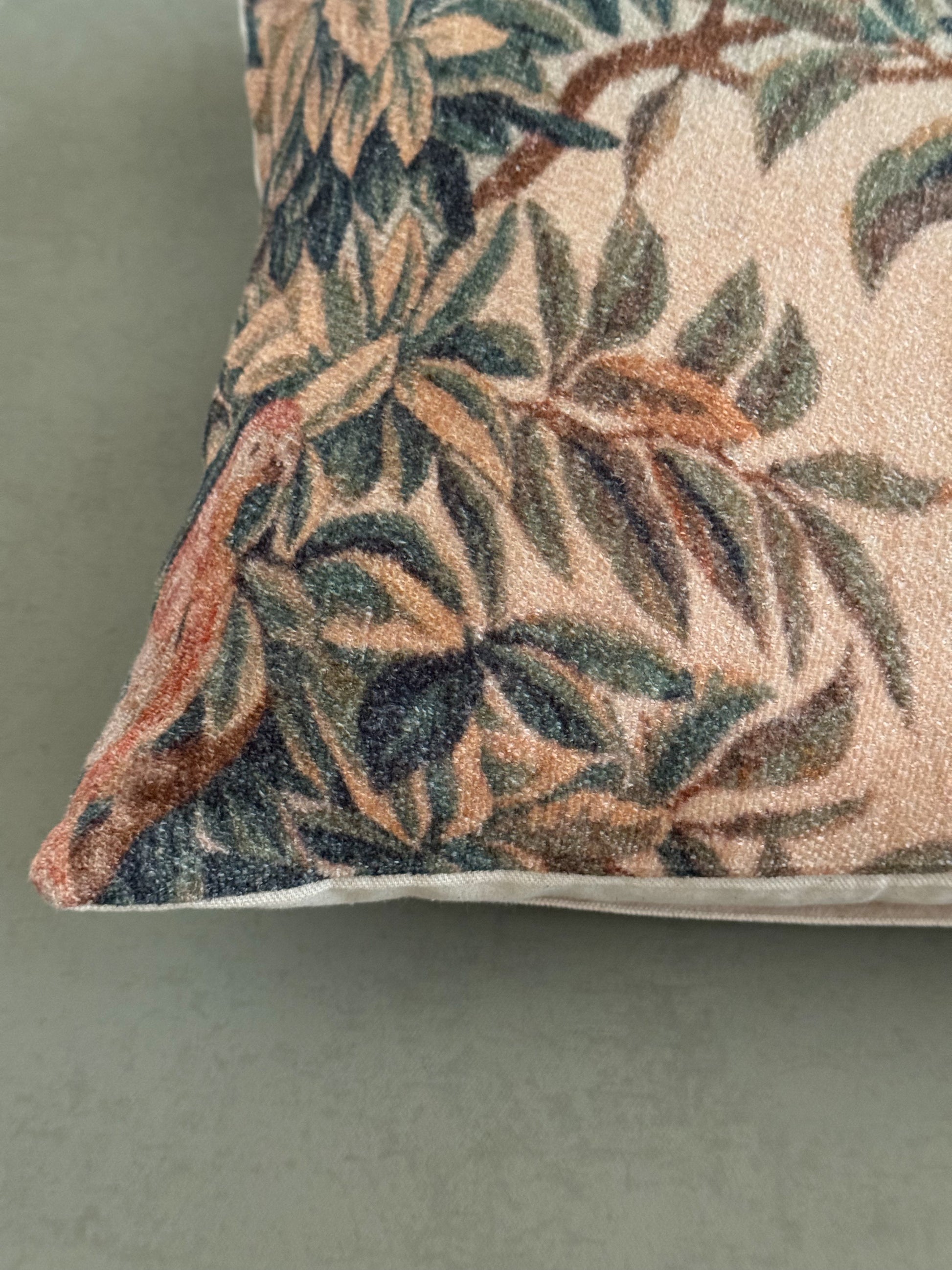 Soft chenille cushion featuring a digital print of leafy branches in subtle green and blue tones with accents of brown and orange. It brings a touch of autumnal nature indoors.
