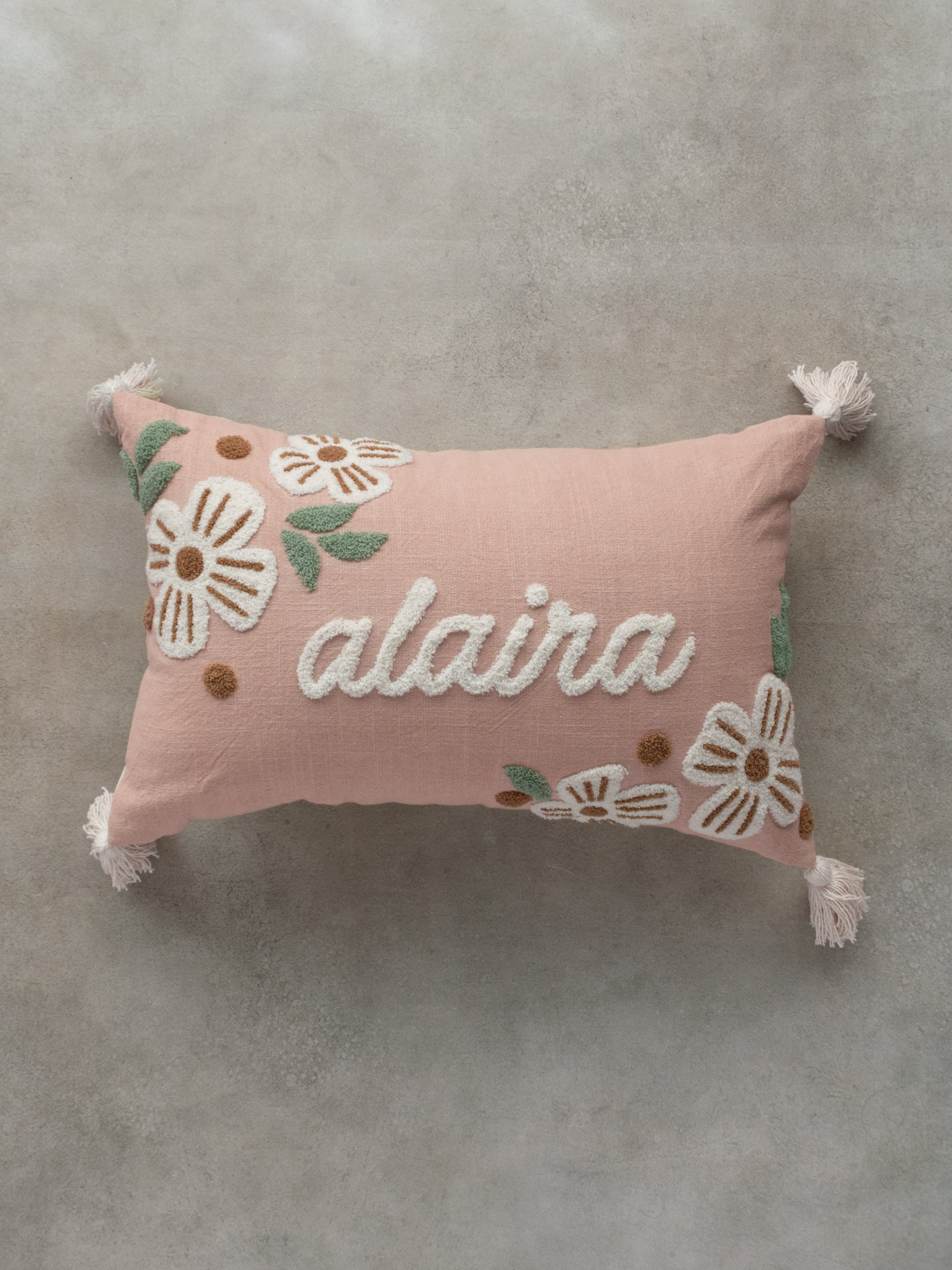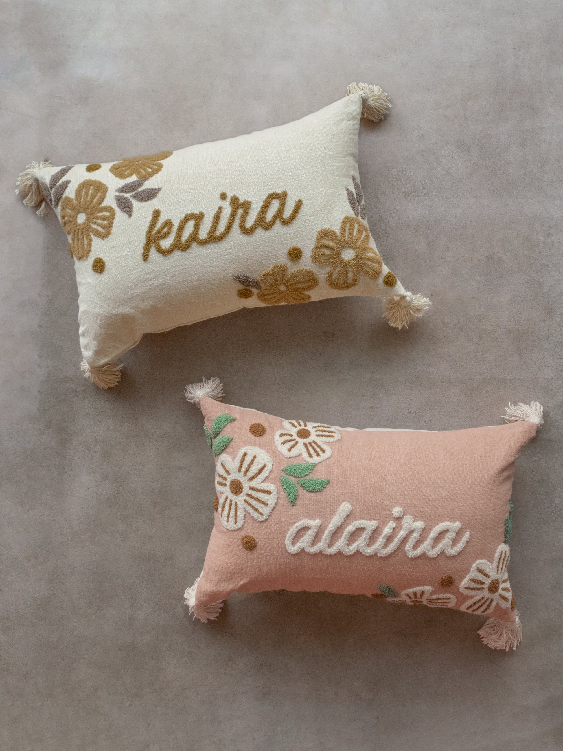 Custom made with floral embroidery, these name cushions are a charming way to personalize your space, crafted with intricate detail that is sure to delight.
