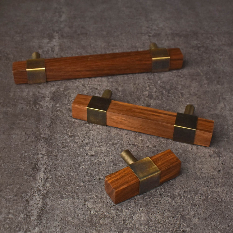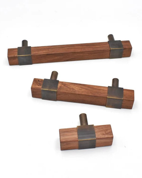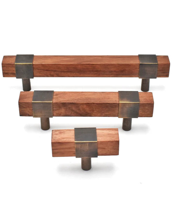 Modern square wood handle with antique brass hardware. This wardrobe handle is handmade by skilled craftsmen and has a sleek and modern look. The antique brass adds a regal touch which works beautifully with the natural tone of the wood. This handle will revamp your chest of drawers, side tables, cupboards, wardrobes and kitchen cabinets.