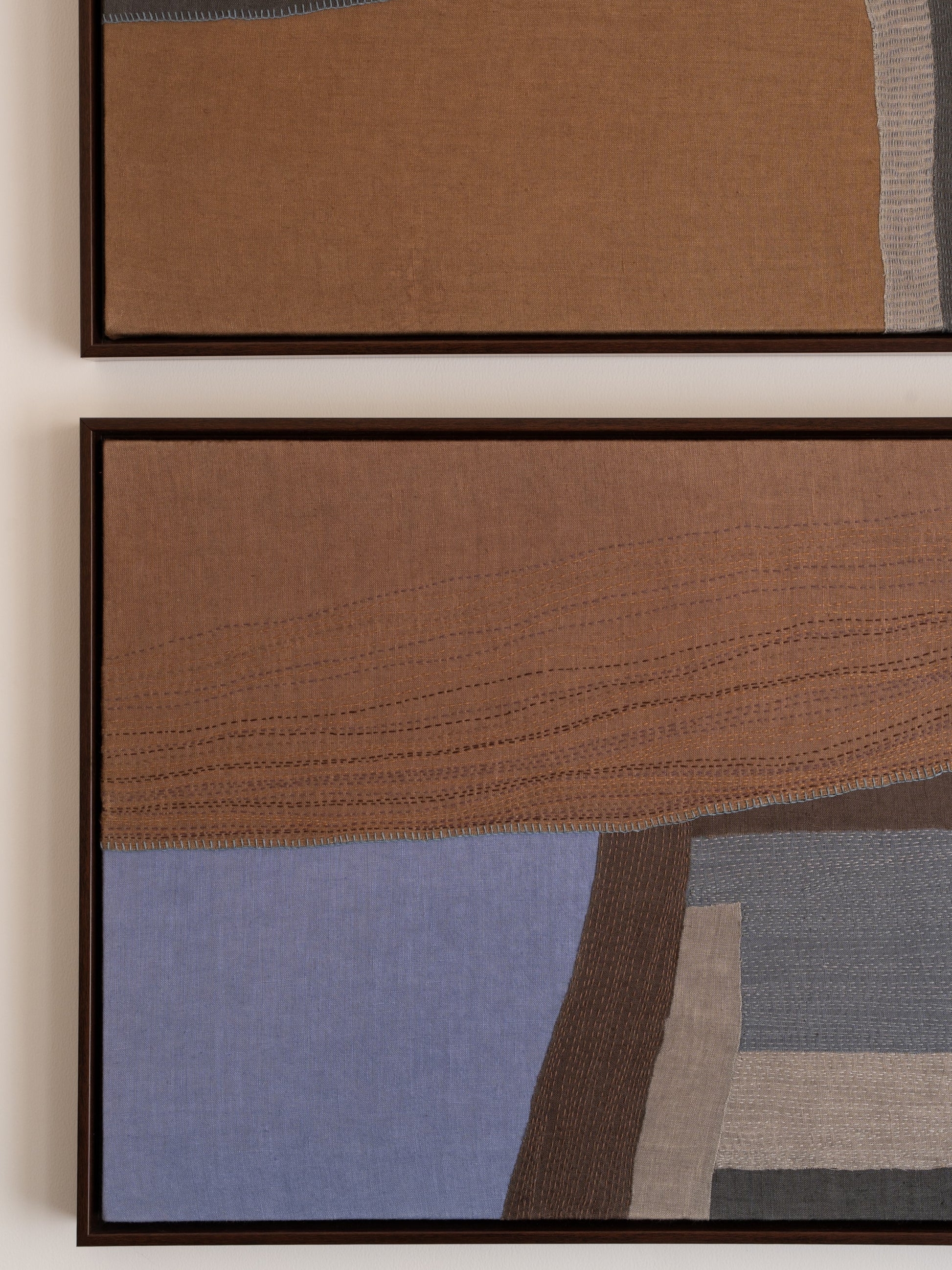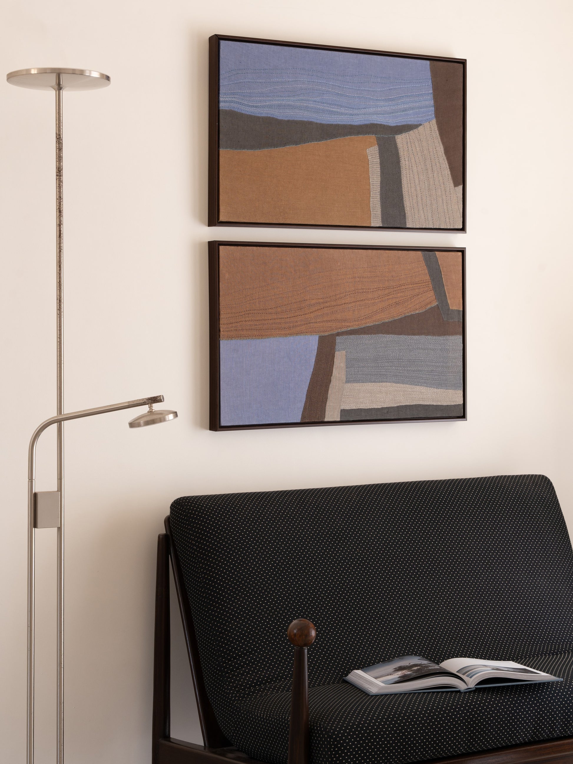 A quiet reflection on place, presence, and the slow passing of time, this set of two artworks speaks through fabric and thread—layered, stitched, and composed by hand. Subtle shifts in color, soft gradients, and delicate textures mirror the ways landscapes hold light, shadow, and memory. There is rhythm in the repetition—marks made stitch by stitch, gently altered with each gesture. Like the terrain we return to, or the scenes we carry in our minds, these works invite a sense of stillness and quiet familiarity. This set brings a grounded calm into your space. More than just something to display, it’s something to live with—something that lingers