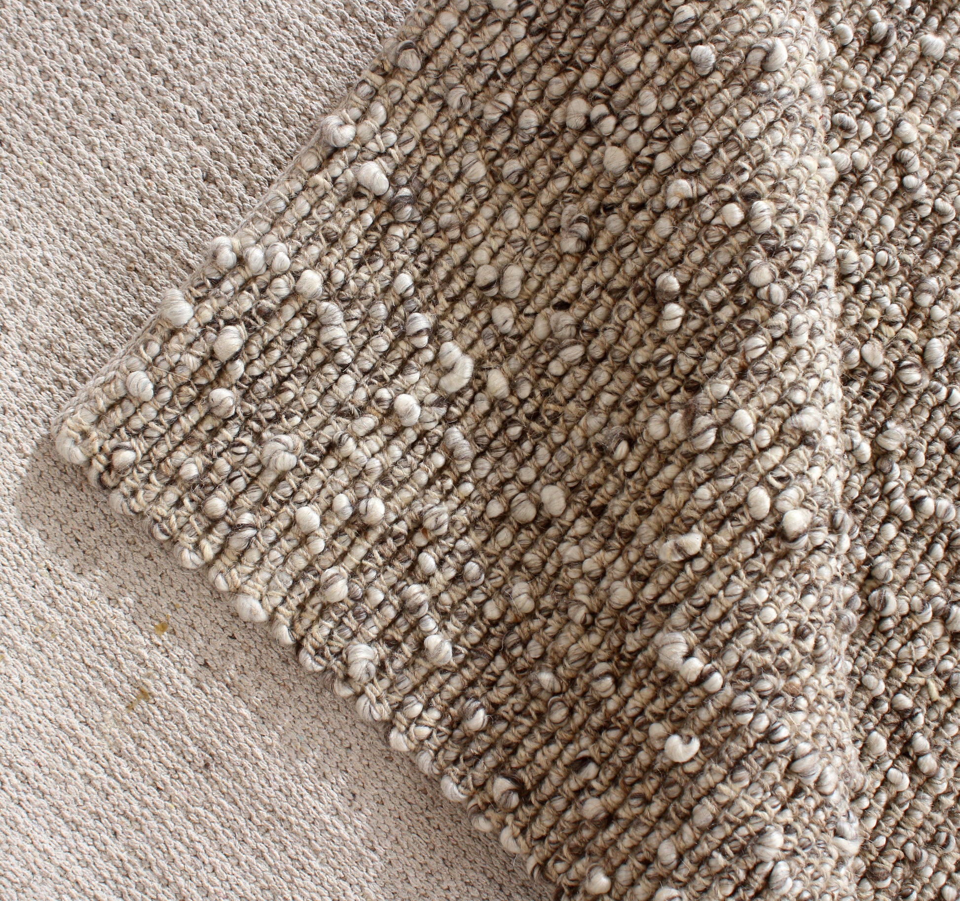 The Itsy Bitsy Rug features a richly textured, handwoven design with looped and knotted wool in soft ivory, beige, and brown tones. Its playful, bumpy surface adds warmth and dimension to any space while maintaining a grounded, neutral palette. Perfect for cozy corners, bedrooms, or laid-back living areas.