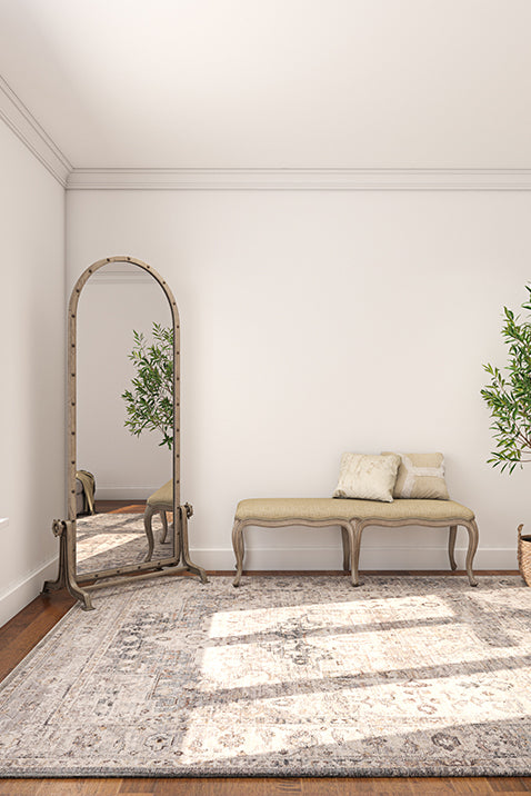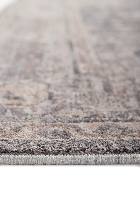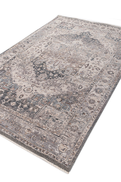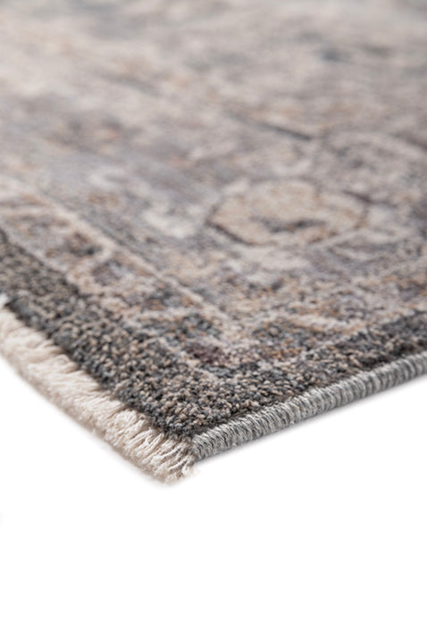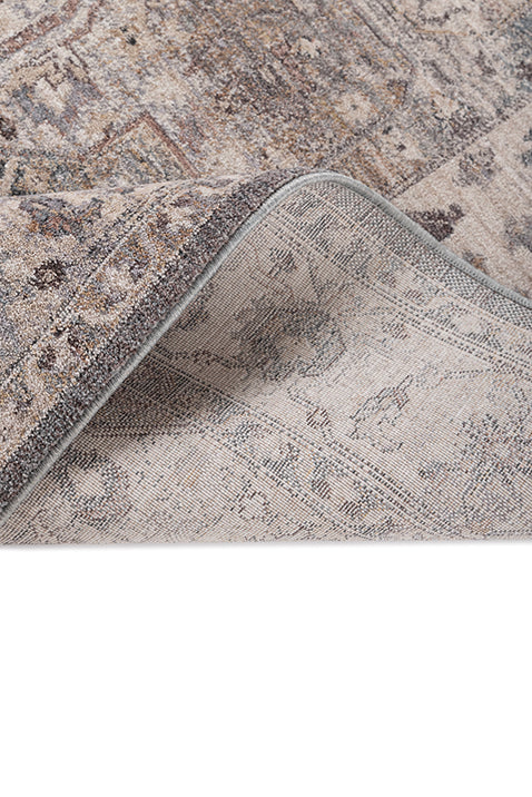 This rug features a beautiful mix of soft beige, warm brown, and subtle gray tones. Its design blends traditional and contemporary elements with a central medallion of delicate floral motifs and a border of repeating geometric patterns. The result is a timeless, elegant piece that adds warmth to any space.