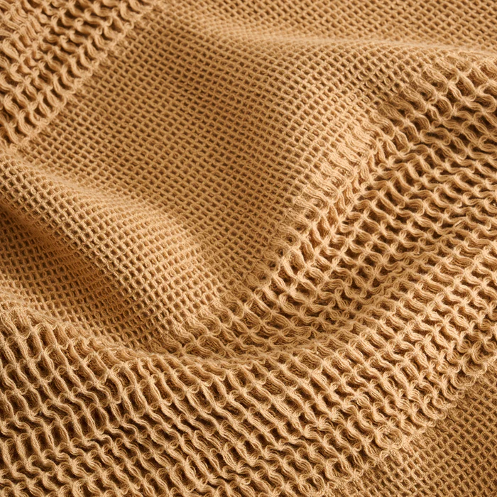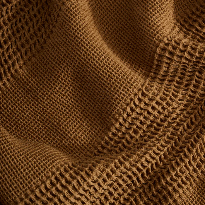 This throw is crafted with a waffle weave that creates a textured surface, bringing a sense of warmth and comfort. The muted earthy tones enhance its natural and understated aesthetic. The throw is finished with thick tassels at the corners, adding a distinctive accent to its design. The soft, breathable fabric adds an inviting layer to your bed or sofa.