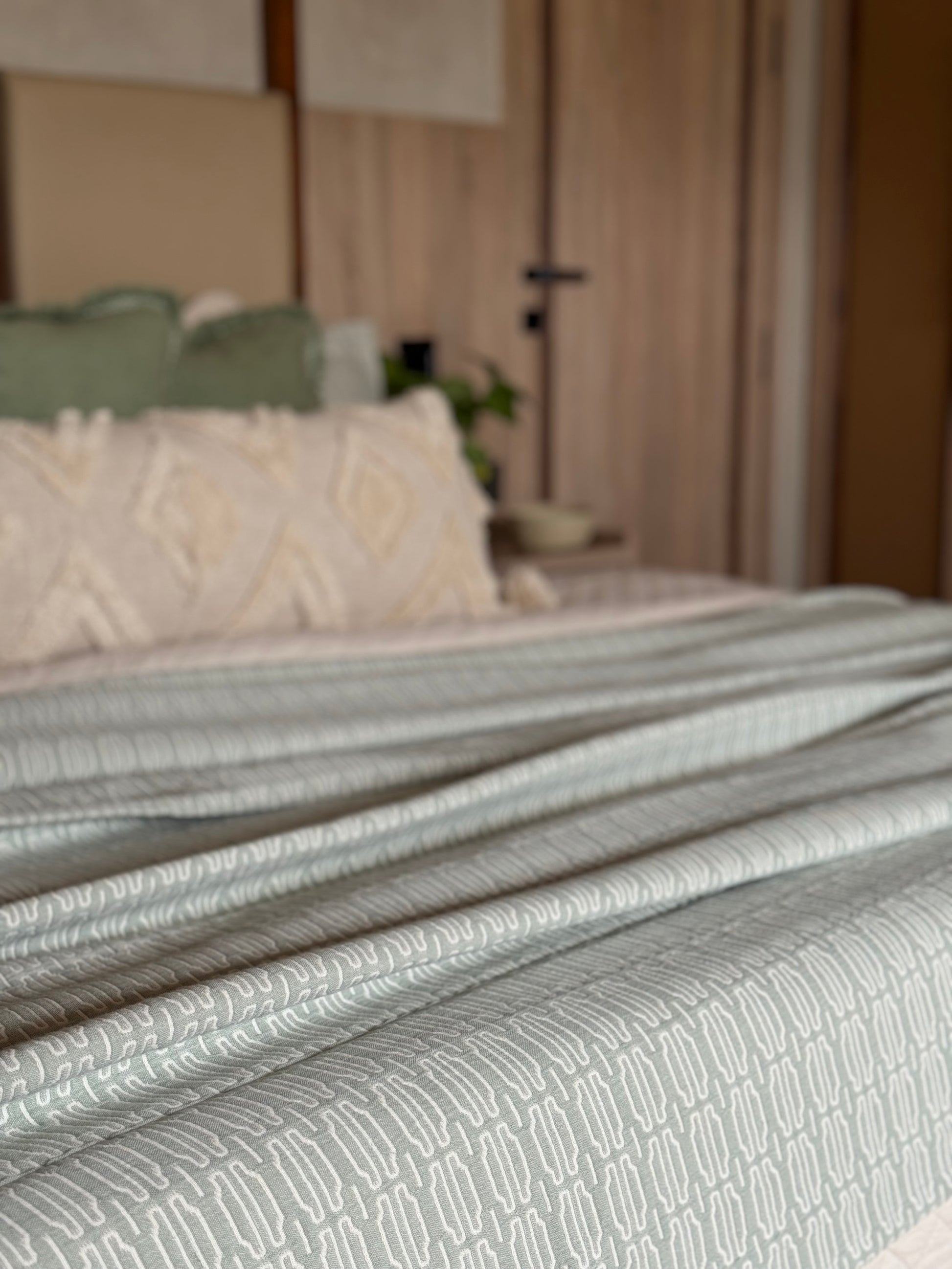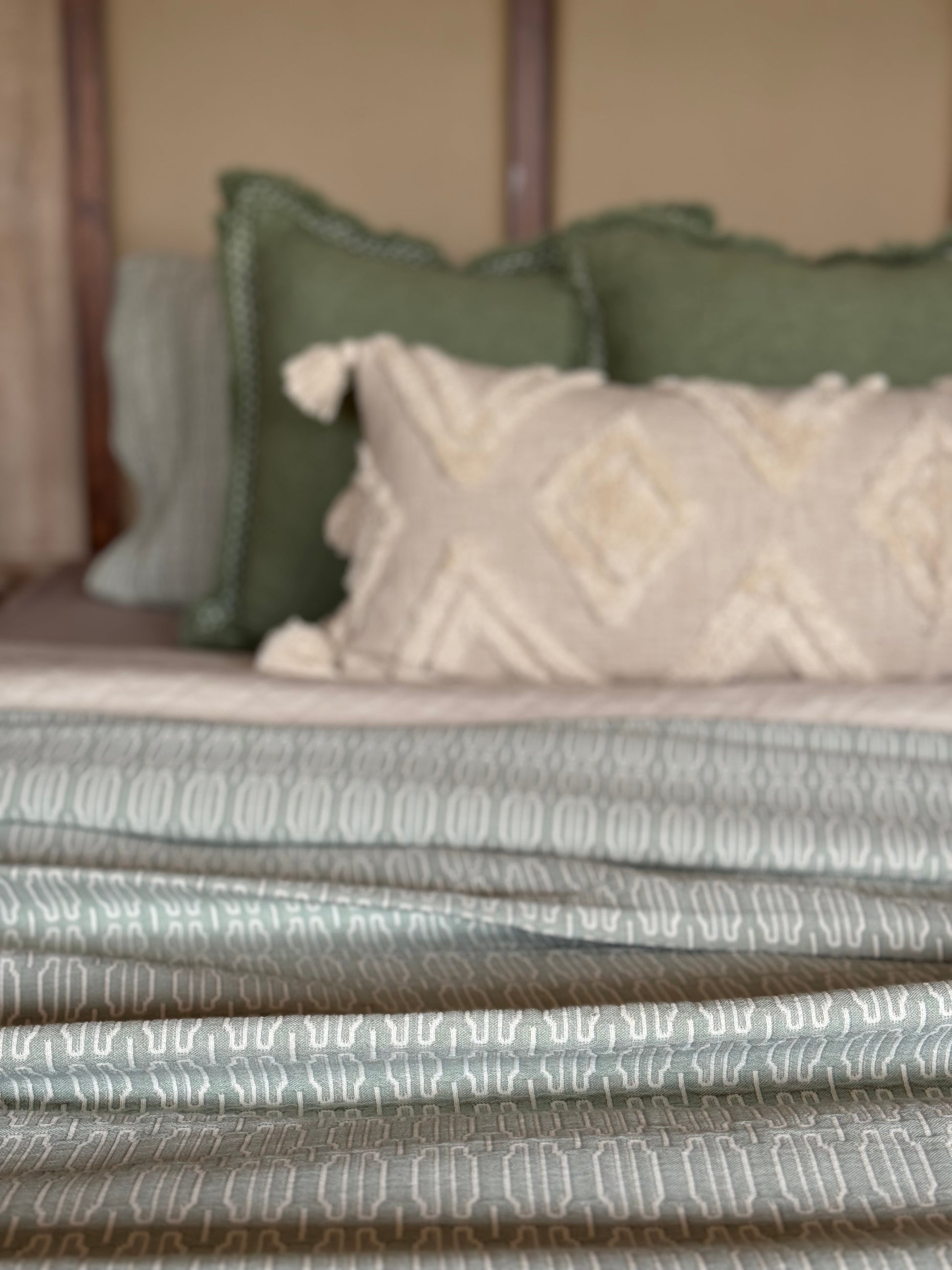 Introducing the Liam Bedding, available in 2 colors and made of 100% cotton. This bedding has a delicate pattern and provides a luxurious and cozy feel for a restful night's sleep. It is also reversible with an ivory base on the back.