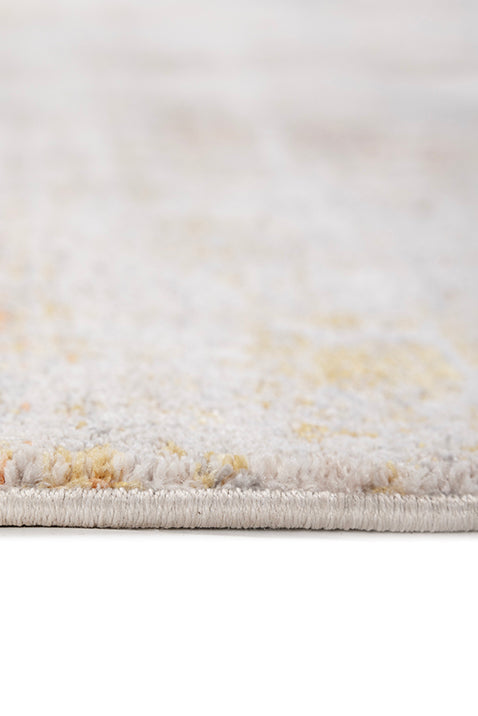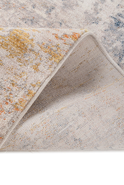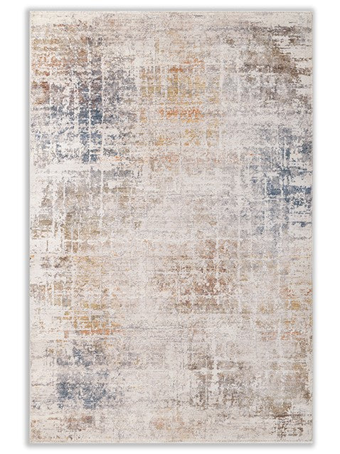 This abstract area rug features a soft, muted color palette of blues, gold, and grays. Its subtle, weathered design adds a touch of boho-chic to any space. The low-profile pile has a soft underfoot and is perfect for layering with other rugs or furniture.
