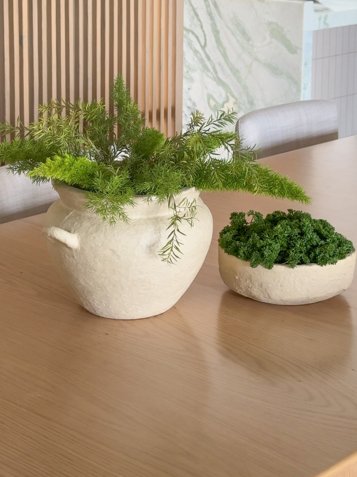 This vase features a round shape and unique paper mache texture that adds significant character to any space. You can style it with fresh stems or flowers to complete the look.