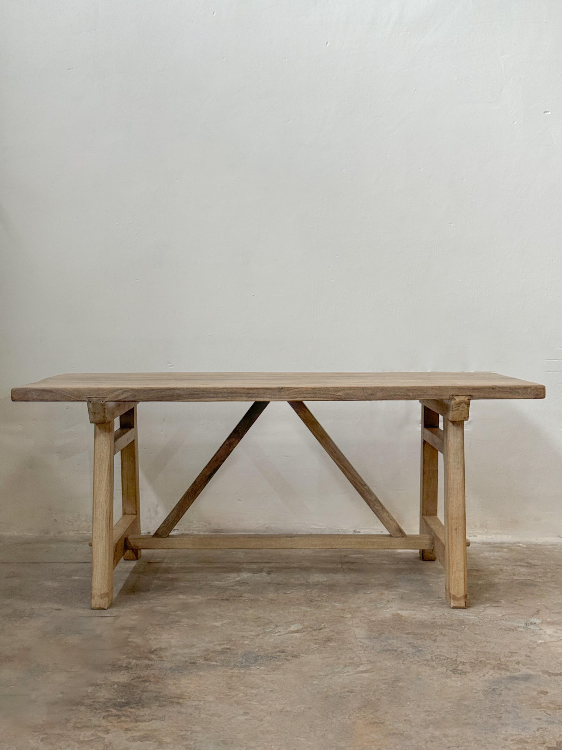 This dining table is crafted from reclaimed saalwood sourced from dismantled mills, buildings, and ships—naturally oil-resistant, chemical-free, and finished in a soft bleach tone. A timeless piece for everyday dining.
