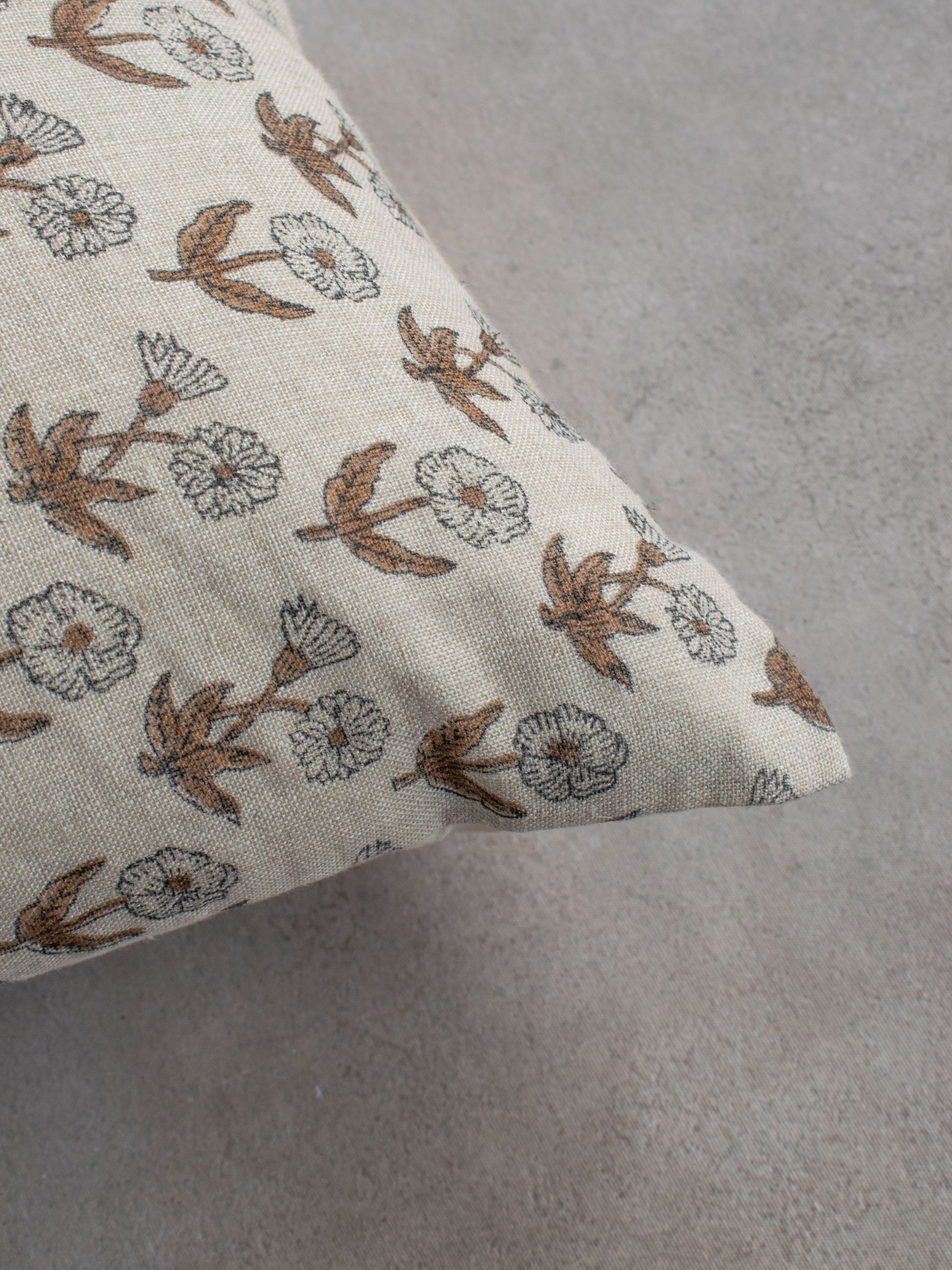 This Block print couch staple cushion is a 100% linen. Beautiful handprint floral details A timeless classic that adds a touch of opulence to any room. Seamlessly blending the intricacies of modern design with the artistry of traditional craftsmanship, this exquisite cushion is sure to be a stunning addition to your home.