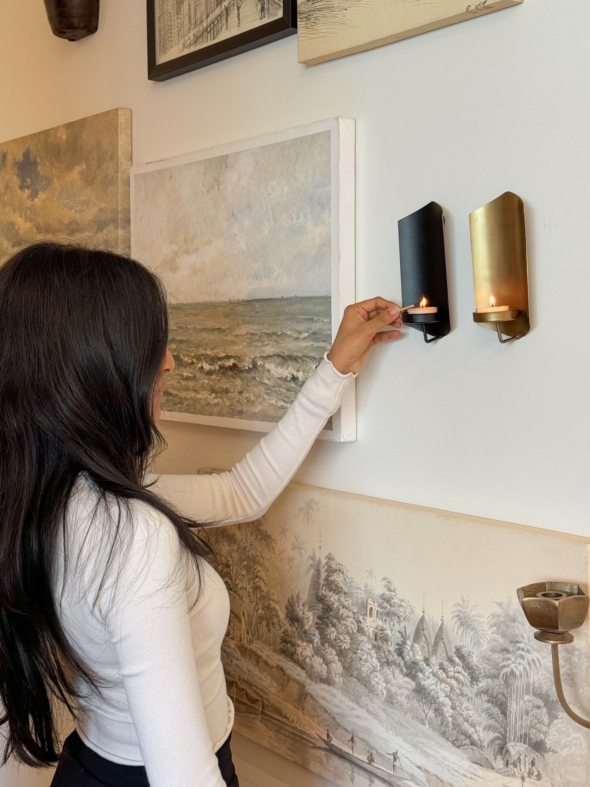 This candle stand adds a touch of elegance to any room with its sleek metal design. It's a sophisticated addition to your home decor, serving as both a functional and stylish wall piece.
