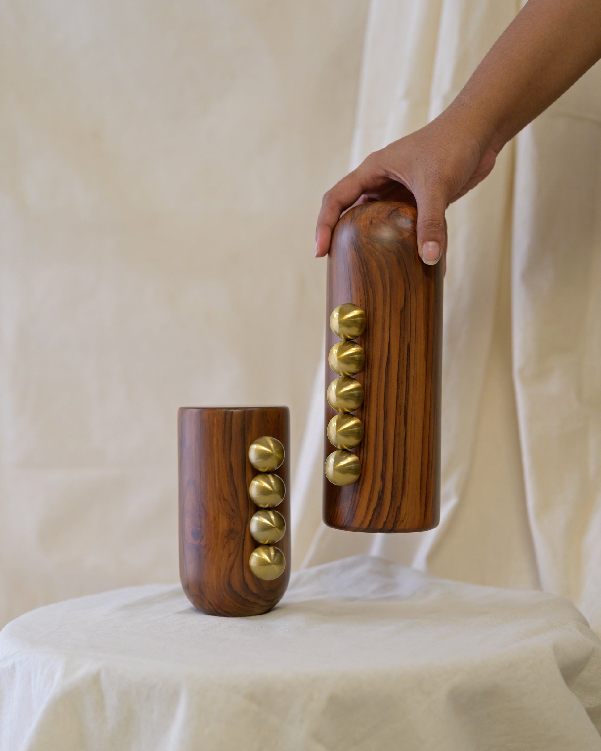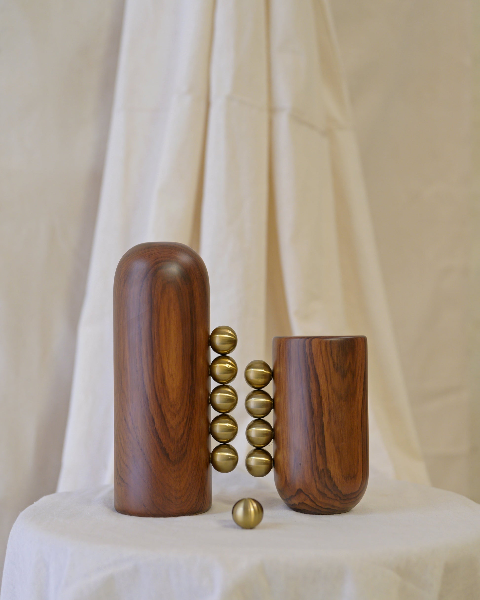 The Pelotas duo stand in their simple silhouette, adorned by the wooden grain unique to each piece, while the brass spheres add an appealing contrast to the pieces. These decor objects will elevate your space with the warmth and charm of their handcrafted form and texture.