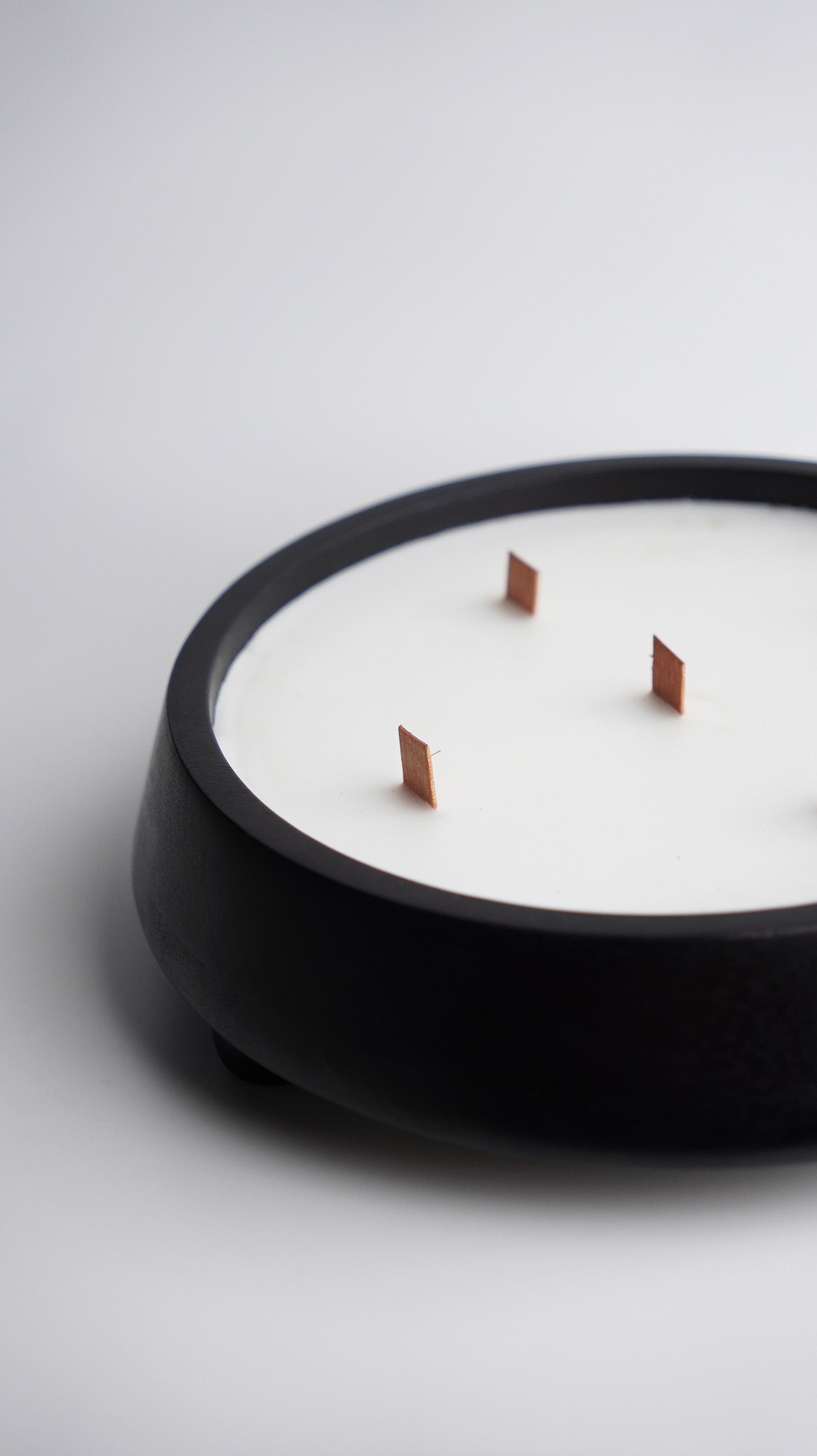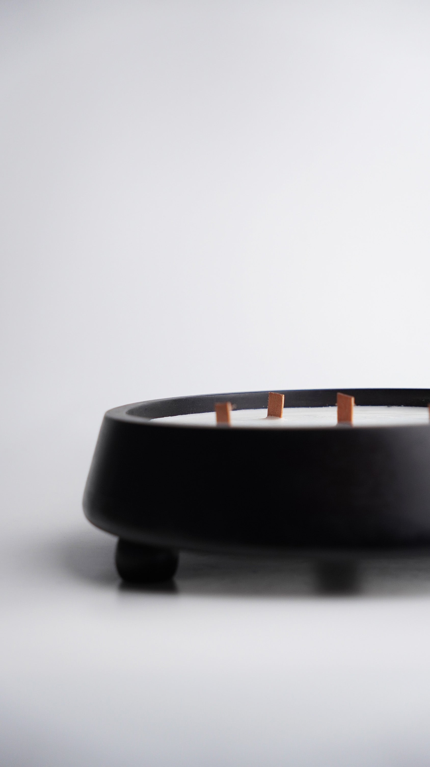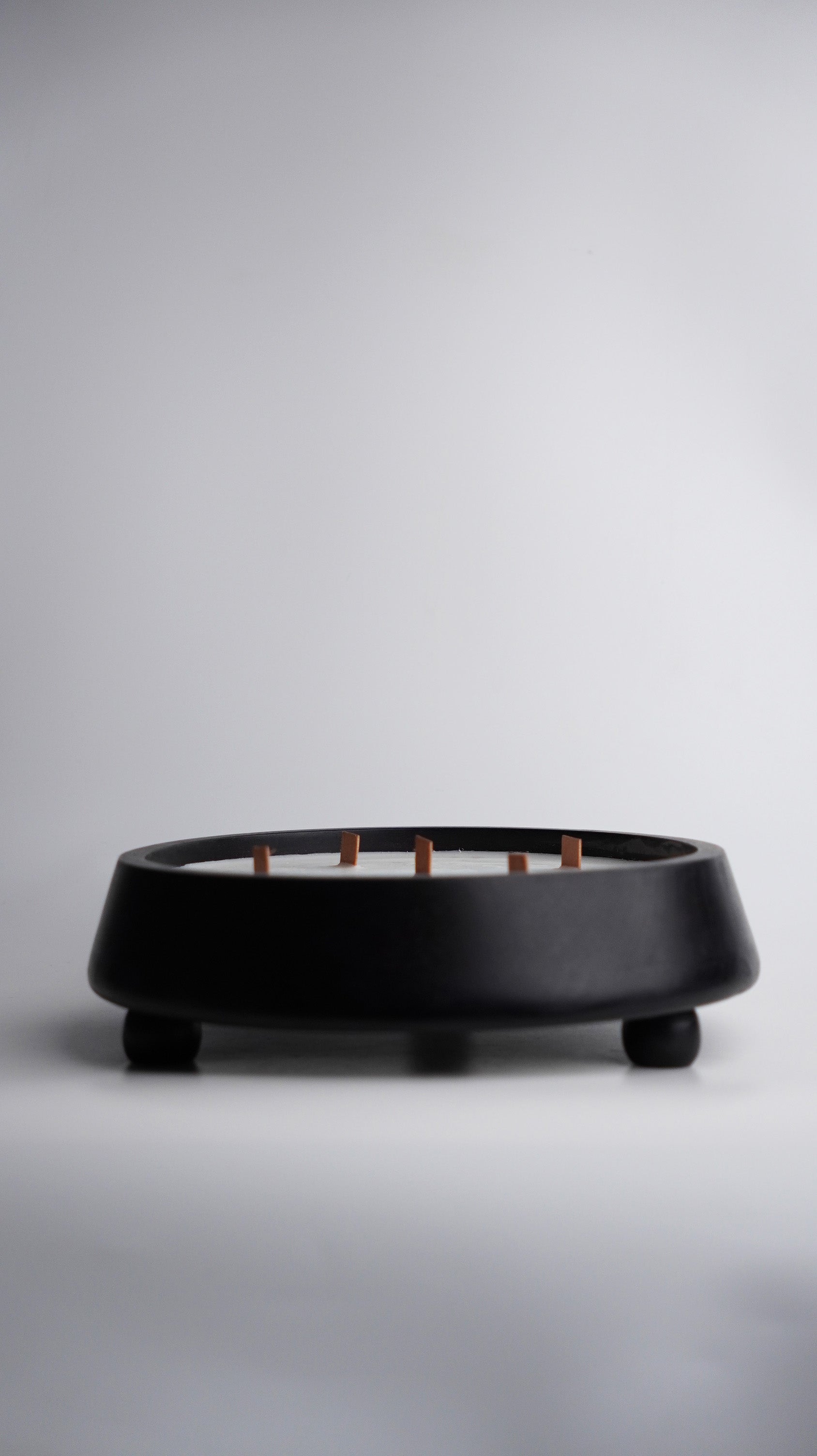 Crafted in a deep blackened wood finish, its form draws inspiration from minimal geometric form — low, grounded, and generous in presence. The smooth circular bowl houses six wooden wicks embedded in a creamy natural wax, creating a captivating multi-flame effect when lit.