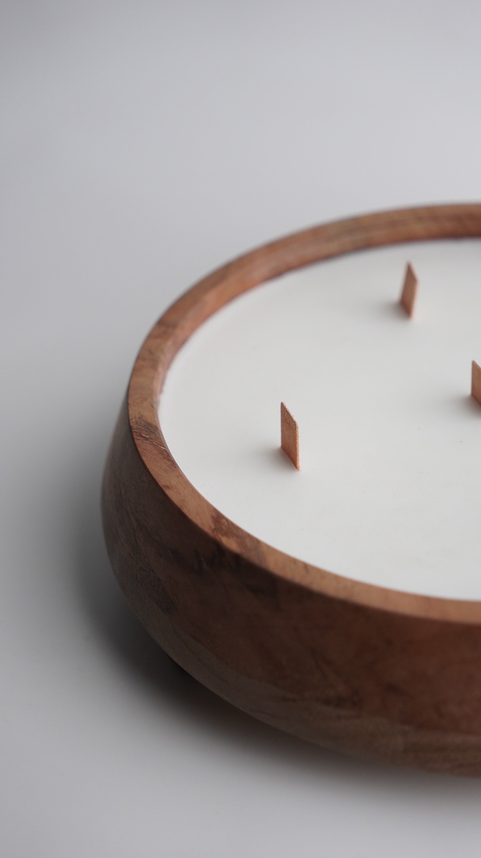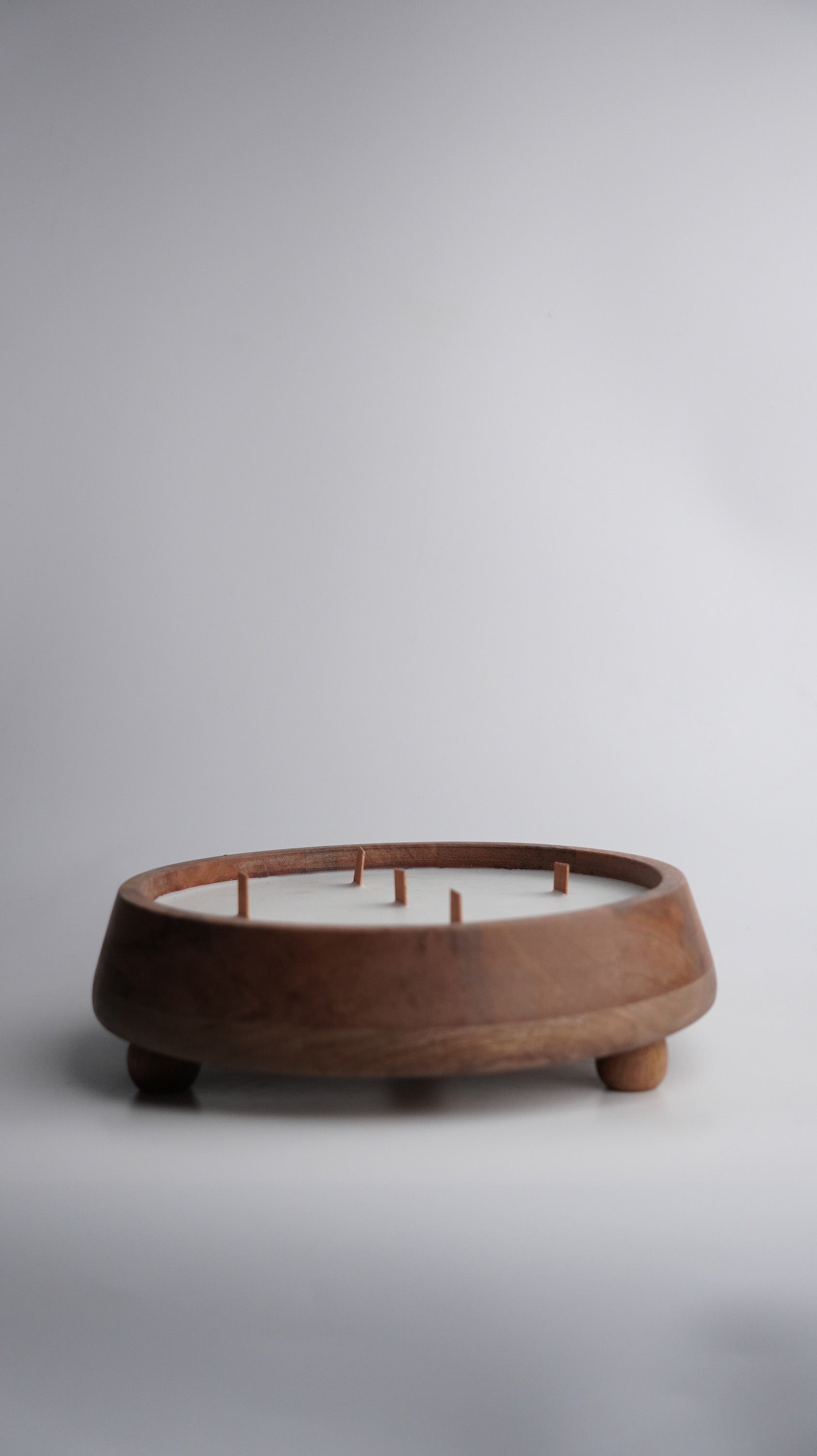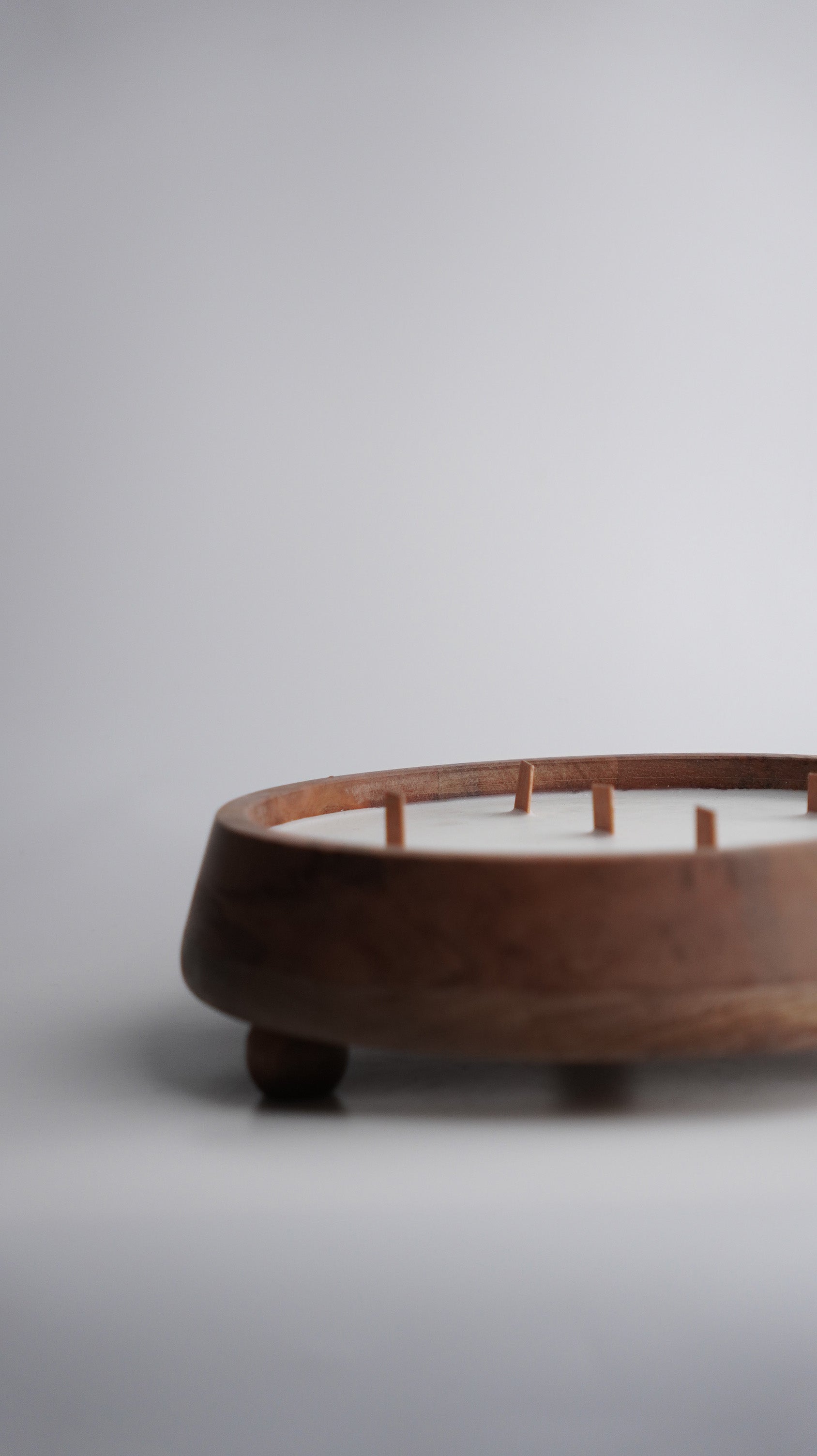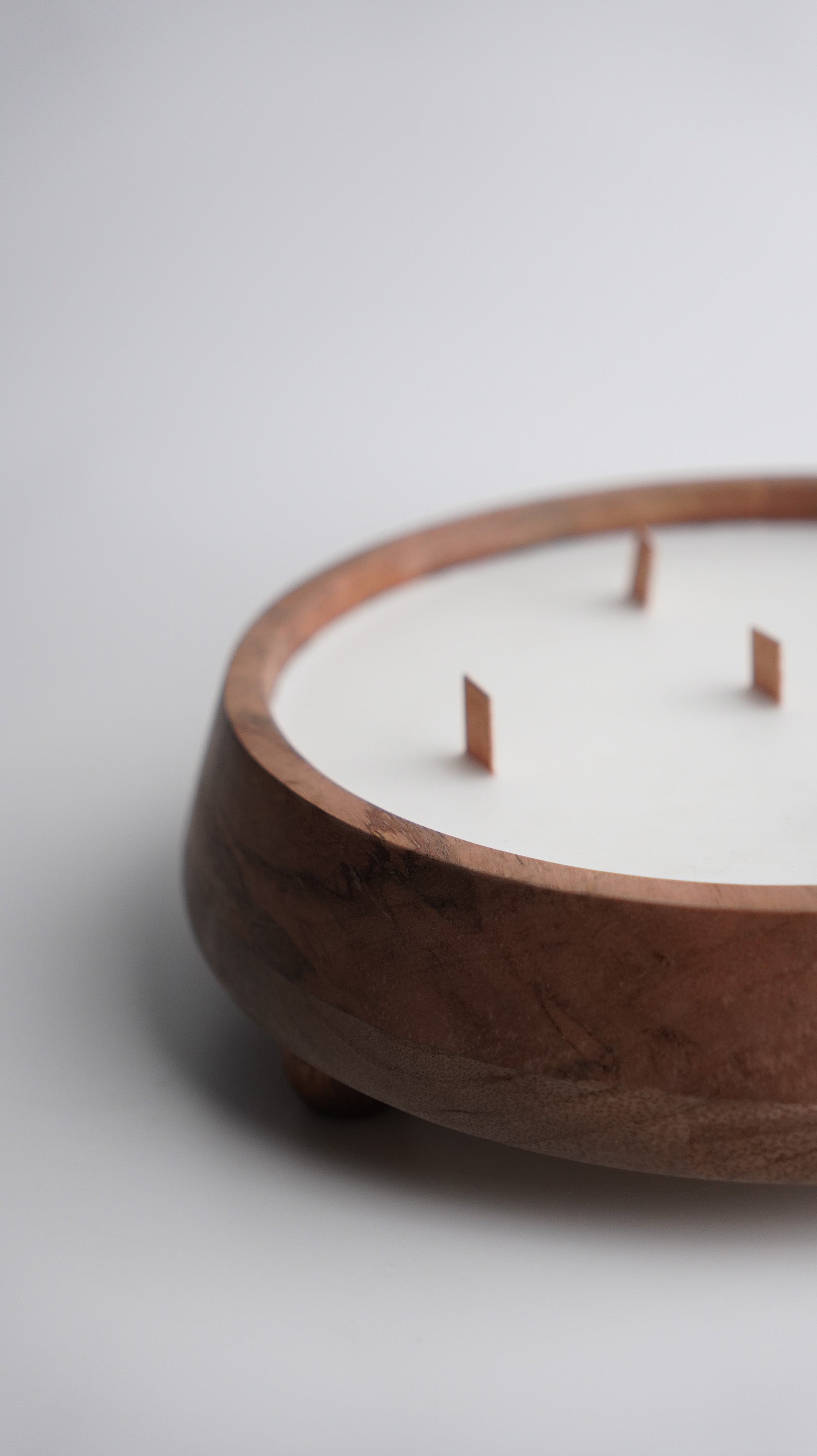 Crafted in a deep blackened wood finish, its form draws inspiration from minimal geometric form — low, grounded, and generous in presence. The smooth circular bowl houses six wooden wicks embedded in a creamy natural wax, creating a captivating multi-flame effect when lit.