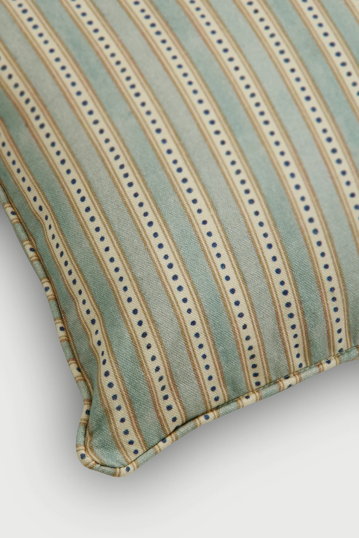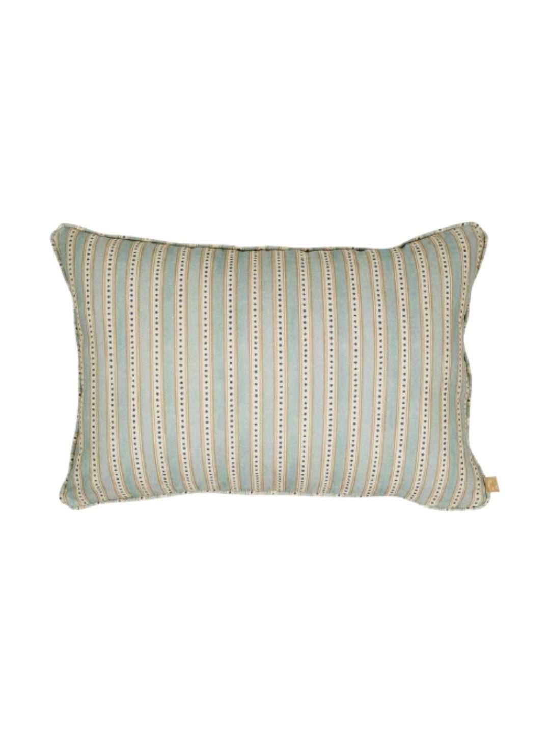 Our River Soft Blue Printed Cotton Oblong Cushion Cover features hand-painted vertical stripes by Ramita, printed on durable cotton duck fabric. Both front and back display the soft blue stripe pattern, finished with matching fabric piping for a refined look.