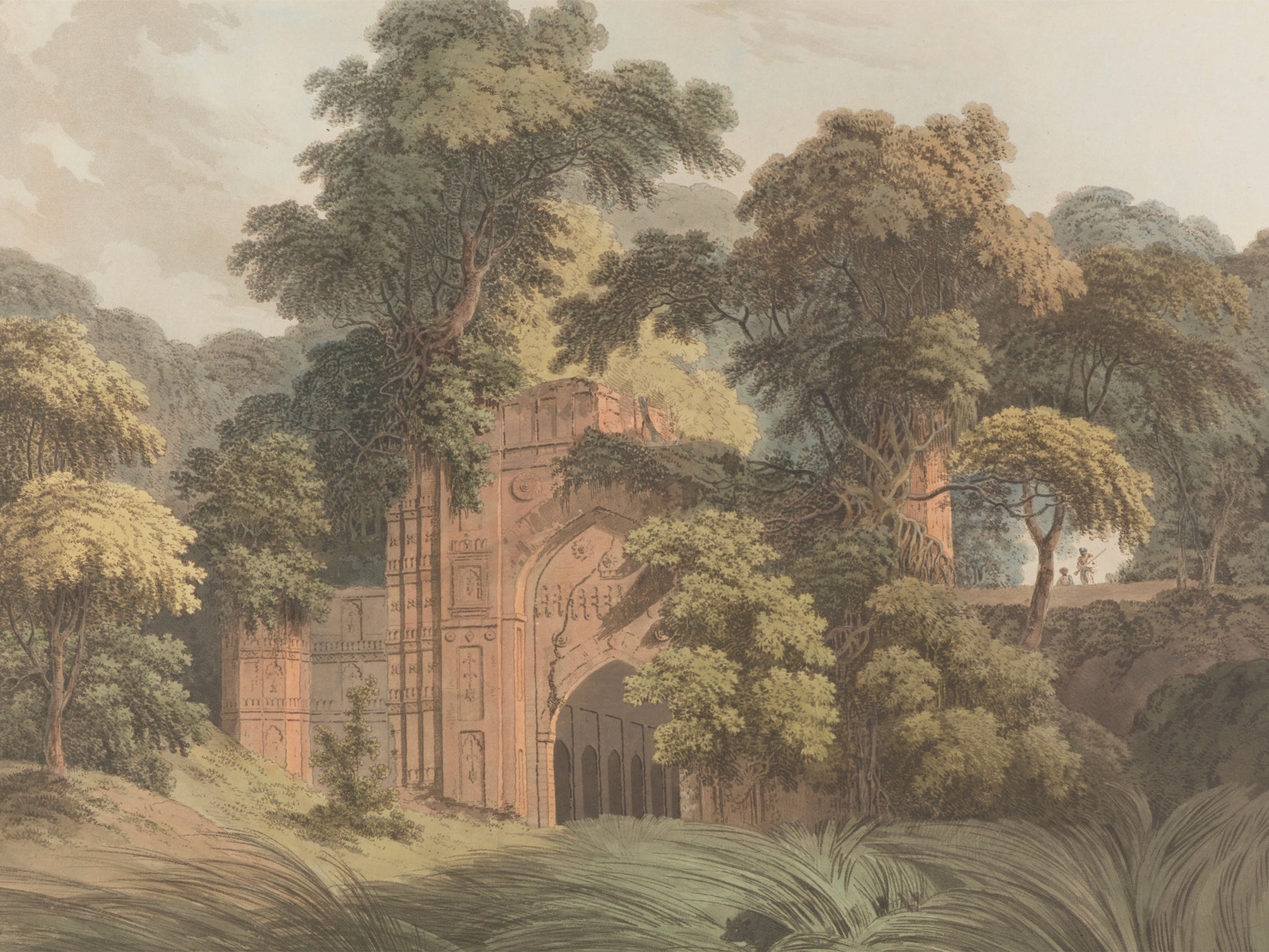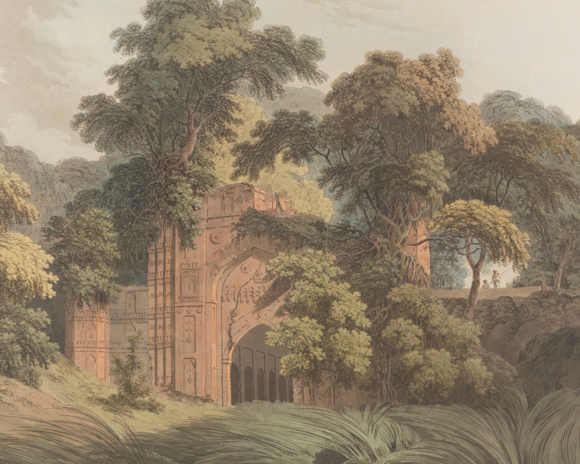 A hauntingly beautiful vintage painting from the 1800s, showcasing the ruins of the ancient city of Gaur, entwined with lush forest, evoking a sense of mystery and history.
