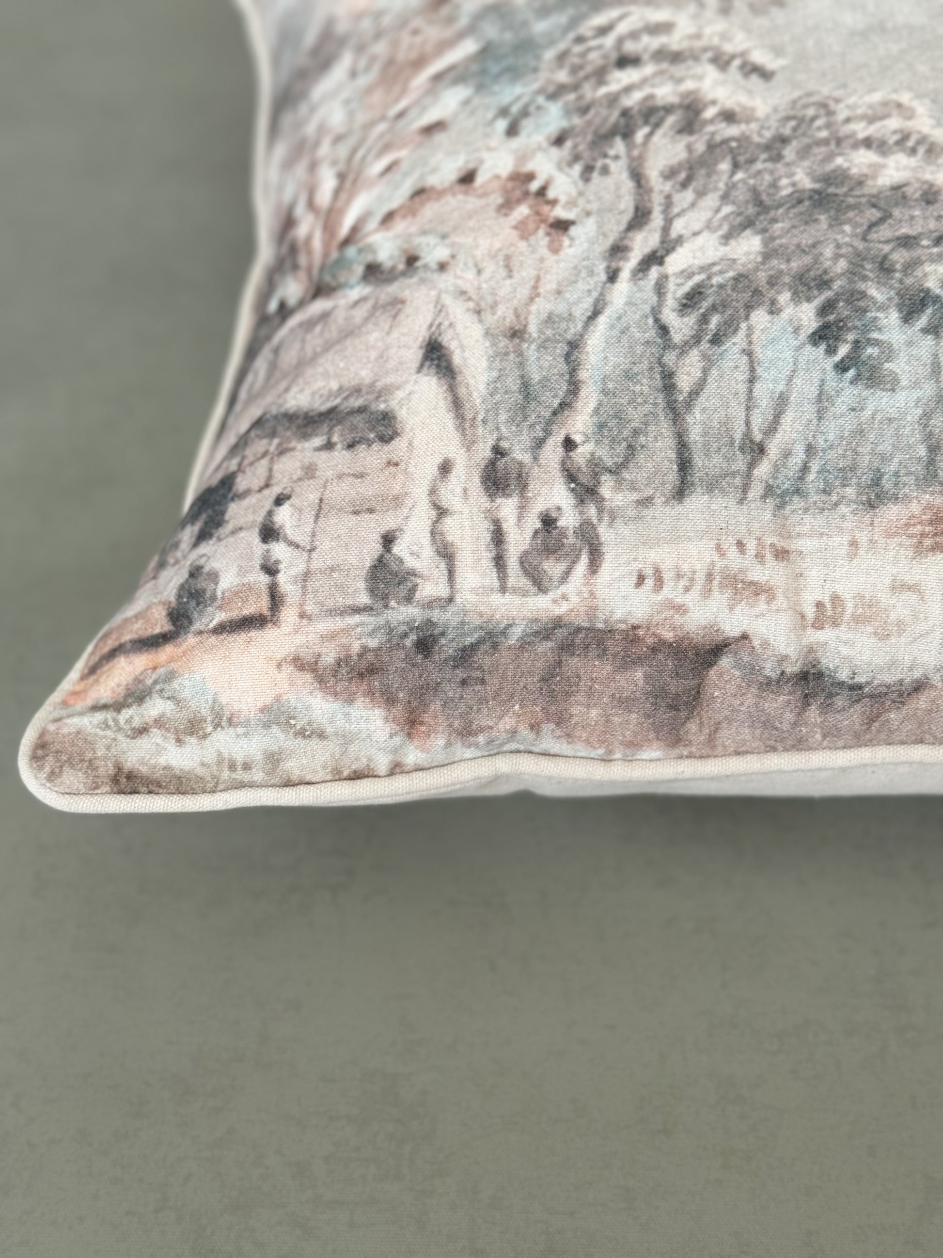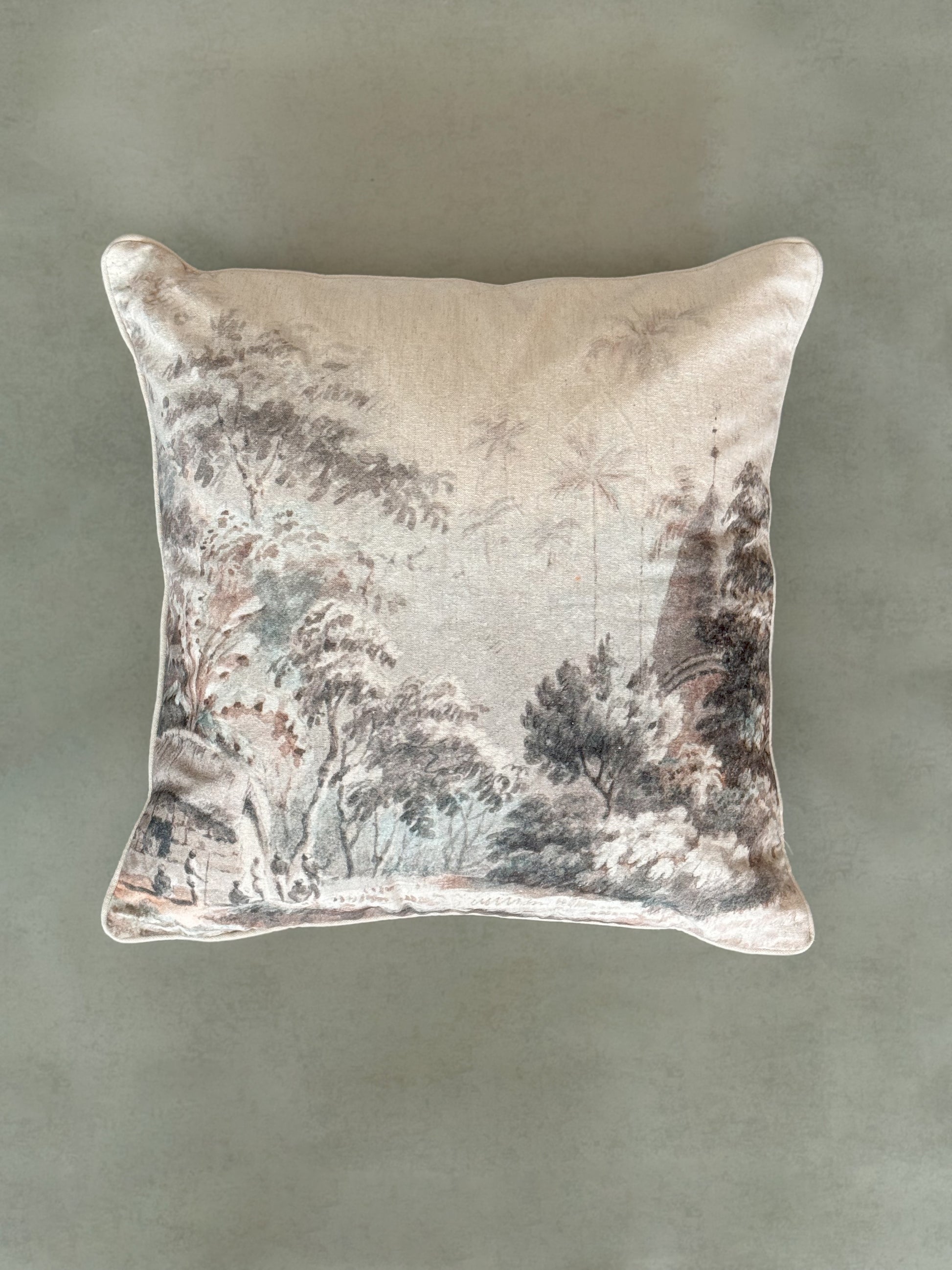 Printed on soft cotton base, the cushion features a digital countryside scene in calming, neutral green shades. Inspired by pastoral landscapes, it adds a serene and timeless charm to your home.