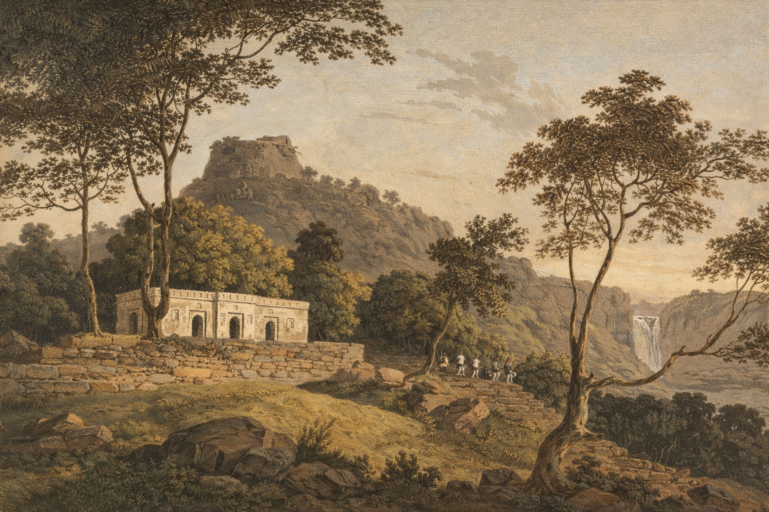 A nostalgic vintage painting from the 1800s, illustrating the winding road leading up to Rotas Ghar, framed by picturesque landscapes that invite exploration and adventure.