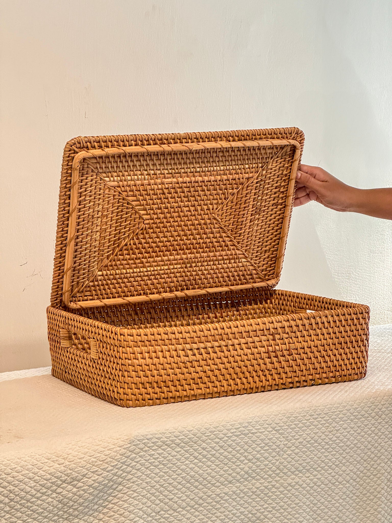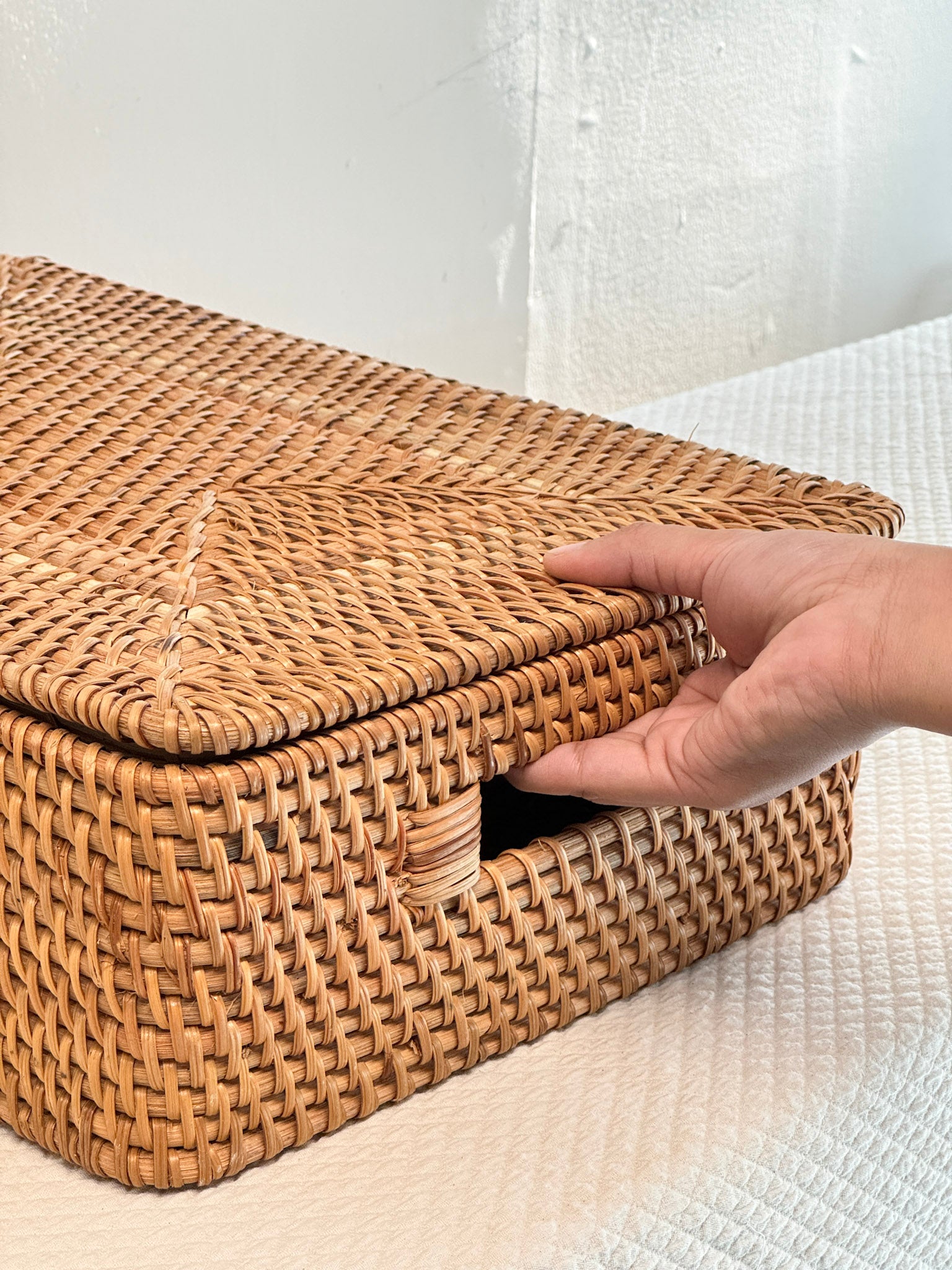 This handwoven storage box is crafted from natural cane with a snug-fit lid and side handles. Perfect for tucking away papers, crafts, cables, under clothes —or anything you want out of sight but close at hand. Neat never looked this good.