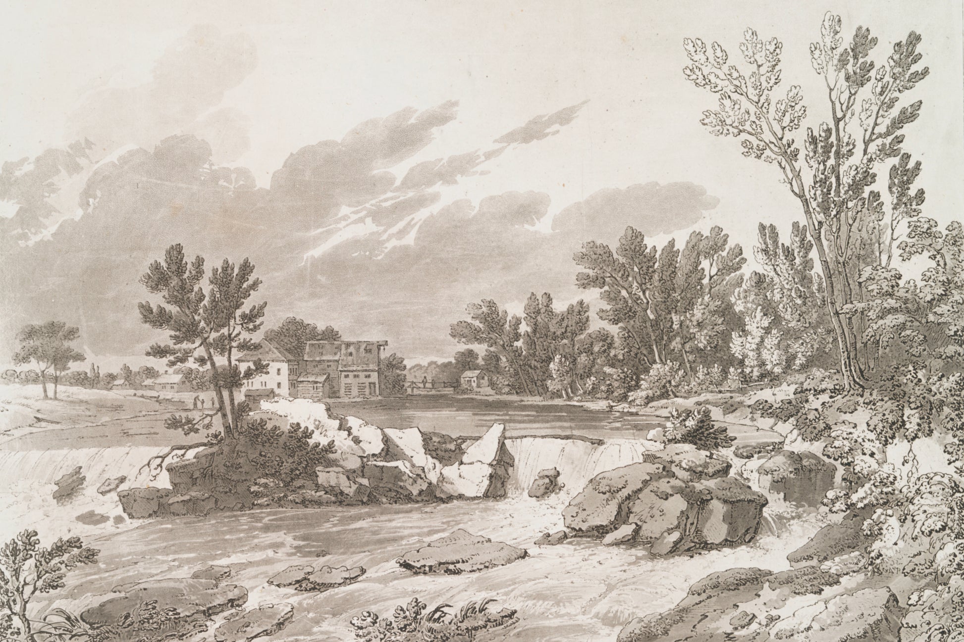 A serene vintage painting of a river flows past rocks and trees near village homes from the 1800s